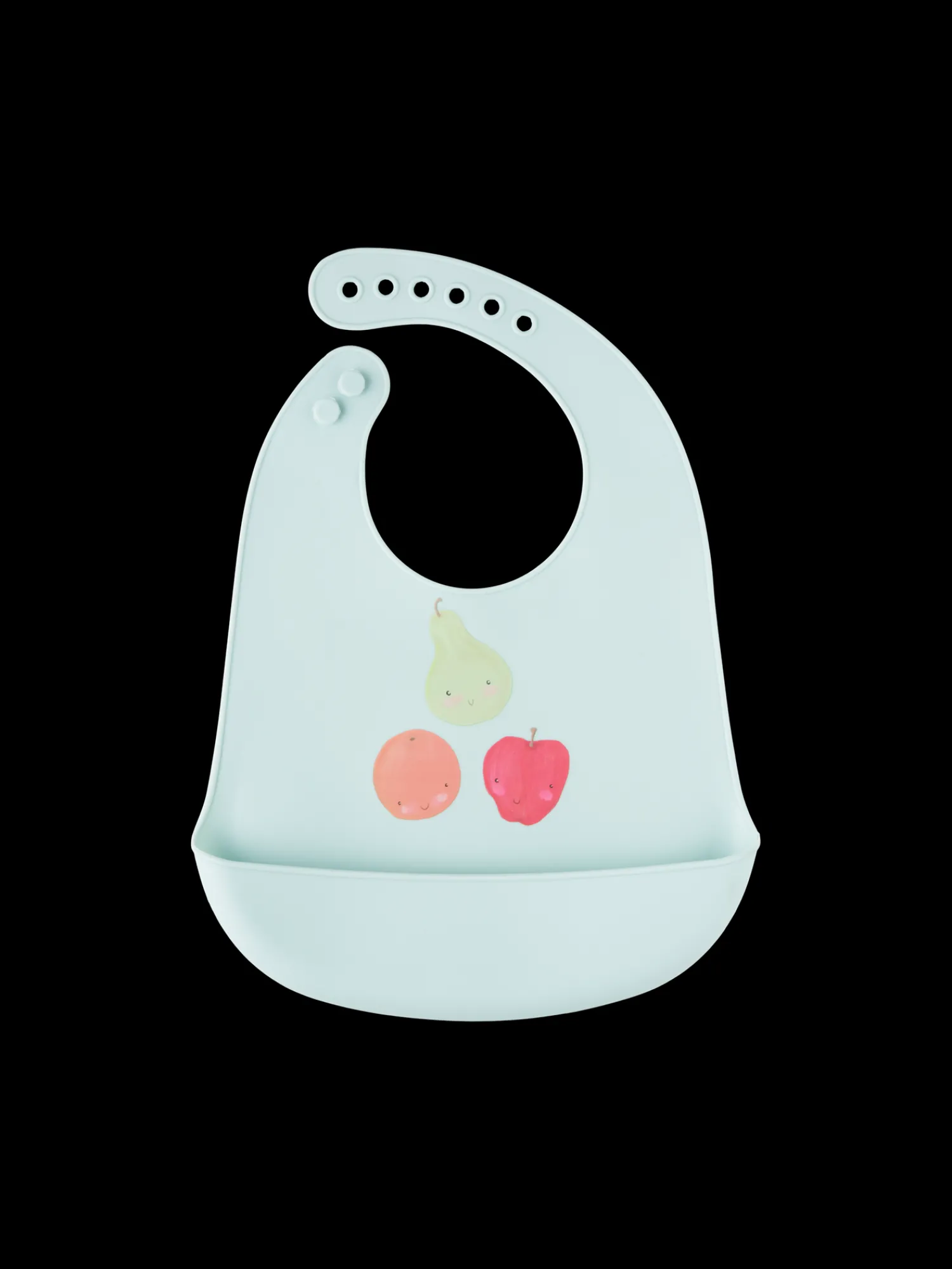 Søstrenes hagesmæk er lavet af silikone og måler 31 x 23 cm.