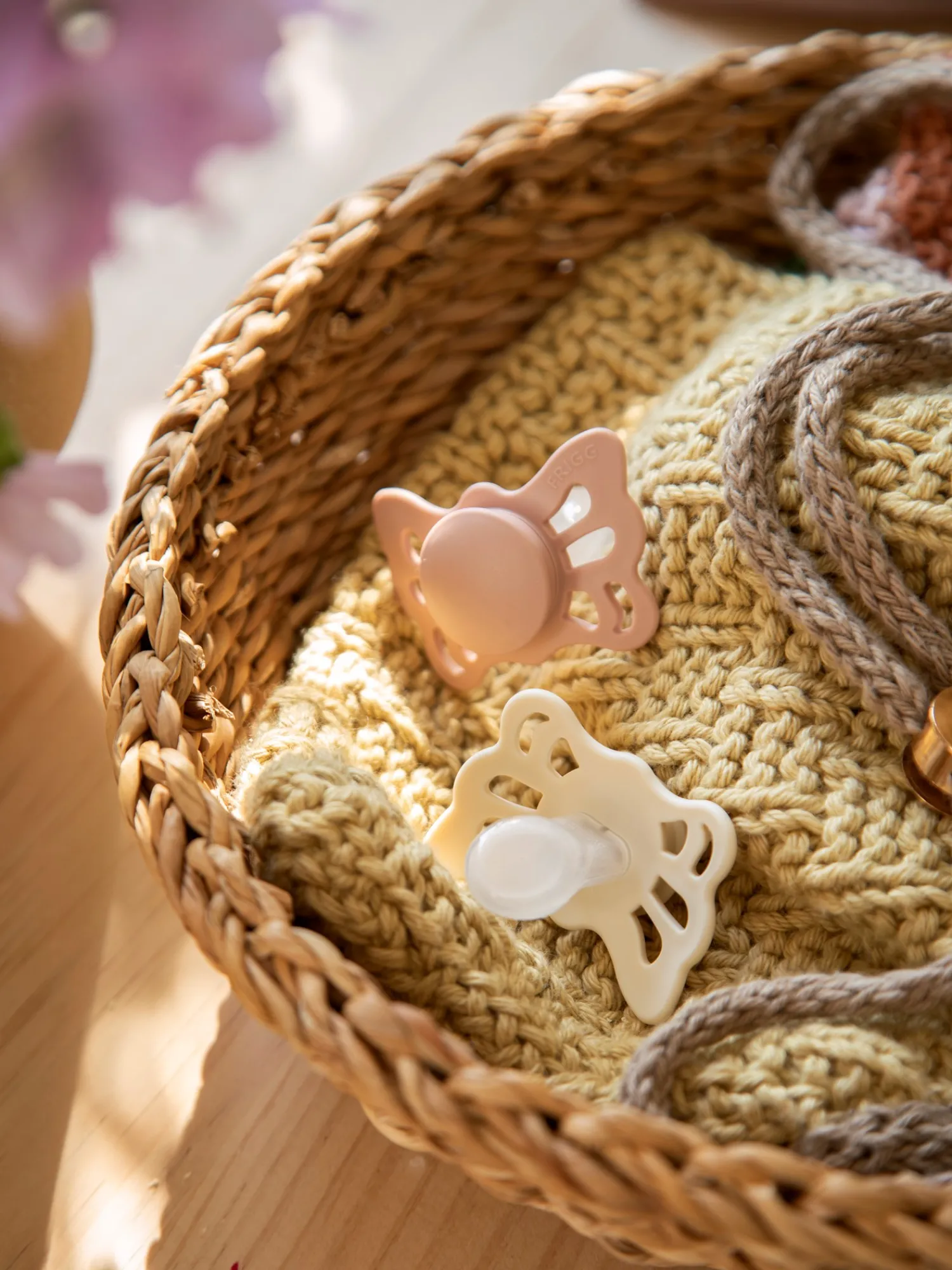 Butterfly-sutterne fra det danske mærke FRIGG er designet og produceret i Danmark. Pakken indeholder 2 FRIGG-sutter. Sutterne har låsemekanismen click-lock® og en ny SilkySoft™ overflade. Sutten er lavet af medicinsk silikone og kommer i en størrelse 1, ideel til alderen 0-6 måneder. Sutten har en anatomisk form og måler 27 mm. Butterfly-sutterne fra FRIGG har form som en sommerfugl. Denne pakke indeholder en Cream-farvet sut og en Blush-farvet sut. Søstrene gør opmærksom på, at sutterne bør udskiftes hver 4.-8. uge af hygiejniske årsager og for optimal sikkerhed. De bør altid tjekke sutten før brug og kassere den ved første tegn på beskadigelse eller slid.