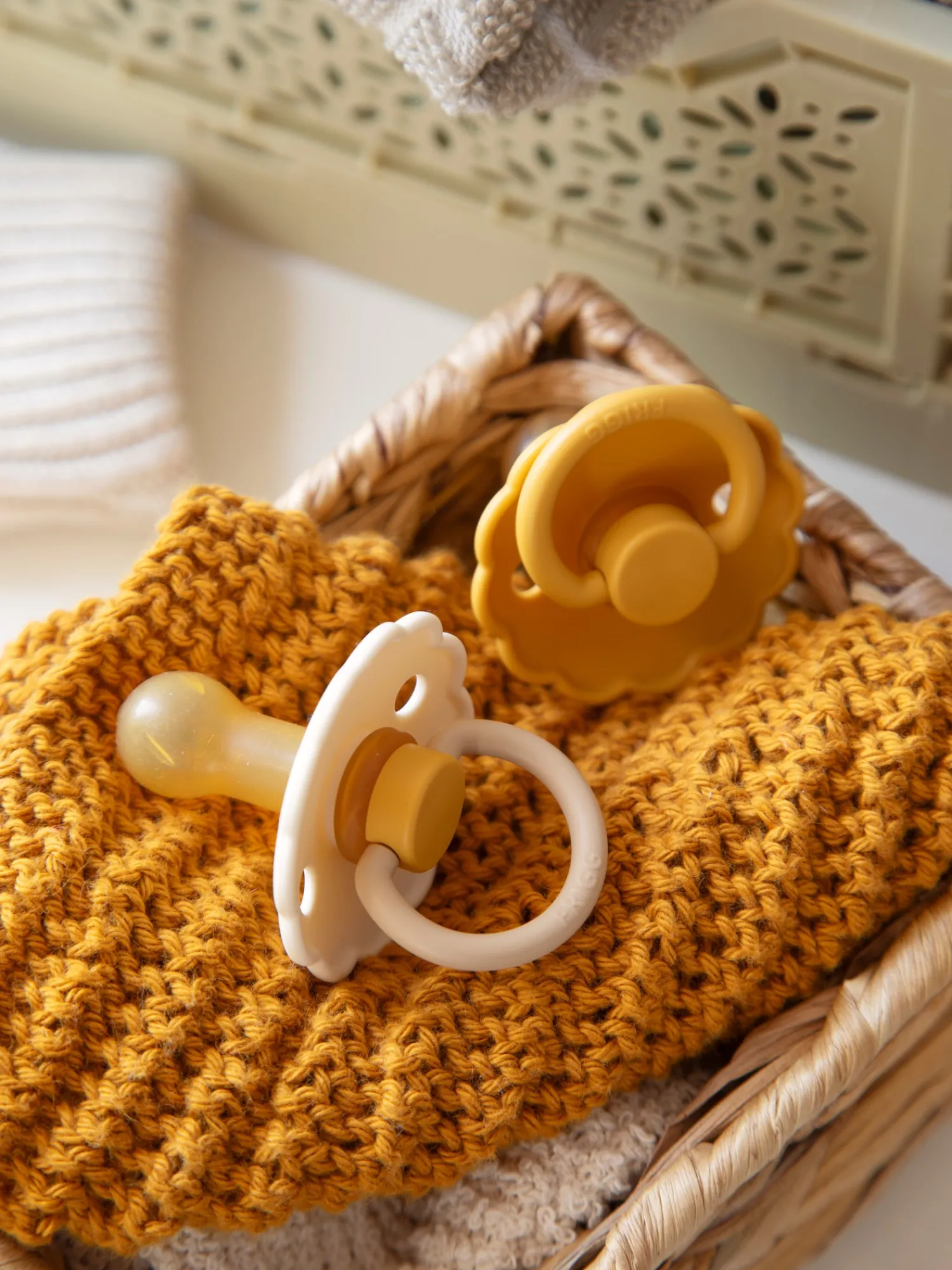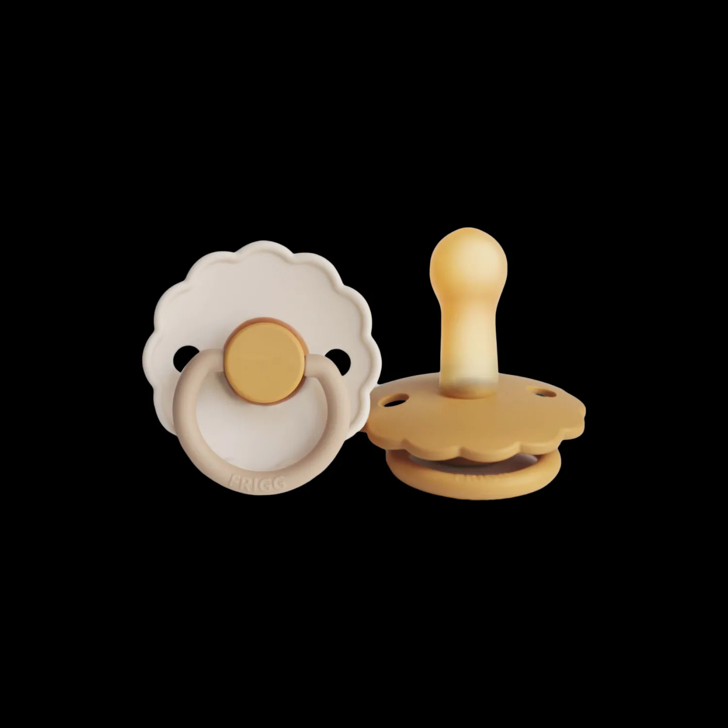 Daisy-sutterne fra det danske mærke FRIGG er designet og produceret i Danmark. Pakken indeholder 2 FRIGG-sutter. Sutterne har låsemekanismen click-lock® og en ny SilkySoft™ overflade. Sutten er lavet af 100% naturgummi og kommer i en størrelse 2, ideel til alderen 6-18 måneder. Sutten er rund og måler 30 mm. Daisy-sutterne fra FRIGG har yndige, flossede kanter, der minder om en særlig blomst: Tusindfryden, som er Danmarks nationalblomst. Denne pakke indeholder en kamillefarvet sut og en Honey Gold-farvet sut. Søstrene gør opmærksom på, at sutterne bør udskiftes hver 4.-8. uge af hygiejniske årsager og for optimal sikkerhed. De bør altid tjekke sutten før brug og kassere den ved første tegn på beskadigelse eller slid.