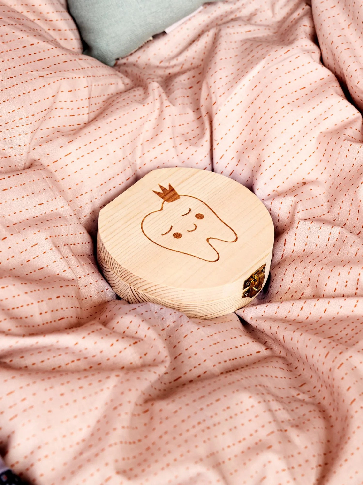 Søstrenes tandæske er lavet af FSC®-certificeret fyrretræ og måler 12 cm i diameter. Der er plads til at skrive navn, fødselsdato, fødselsvægt og fødselslængde inde i låget, samt datoer ud for hver enkelt tand.