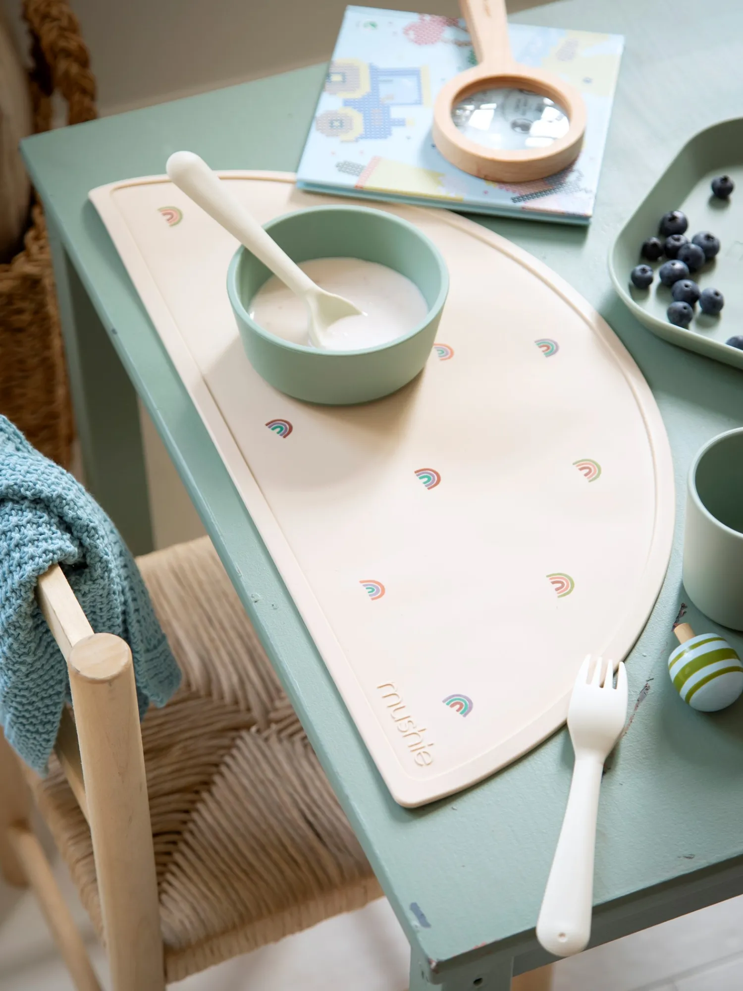 Dækkeservietten fra Mushie er lavet af fødevaregodkendt silikone.Den hjælper med at holde Deres barn og bordet rent. Den ville også passe godt sammen med silikonehagesmækken.Søstrene anbefaler at rengøre den med varmt sæbevand før brug. Bemærk venligst, at produktet altid skal bruges under opsyn af en voksen. Undersøg produktet før hver brug. Afskaf ved tegn på skade eller svaghed.