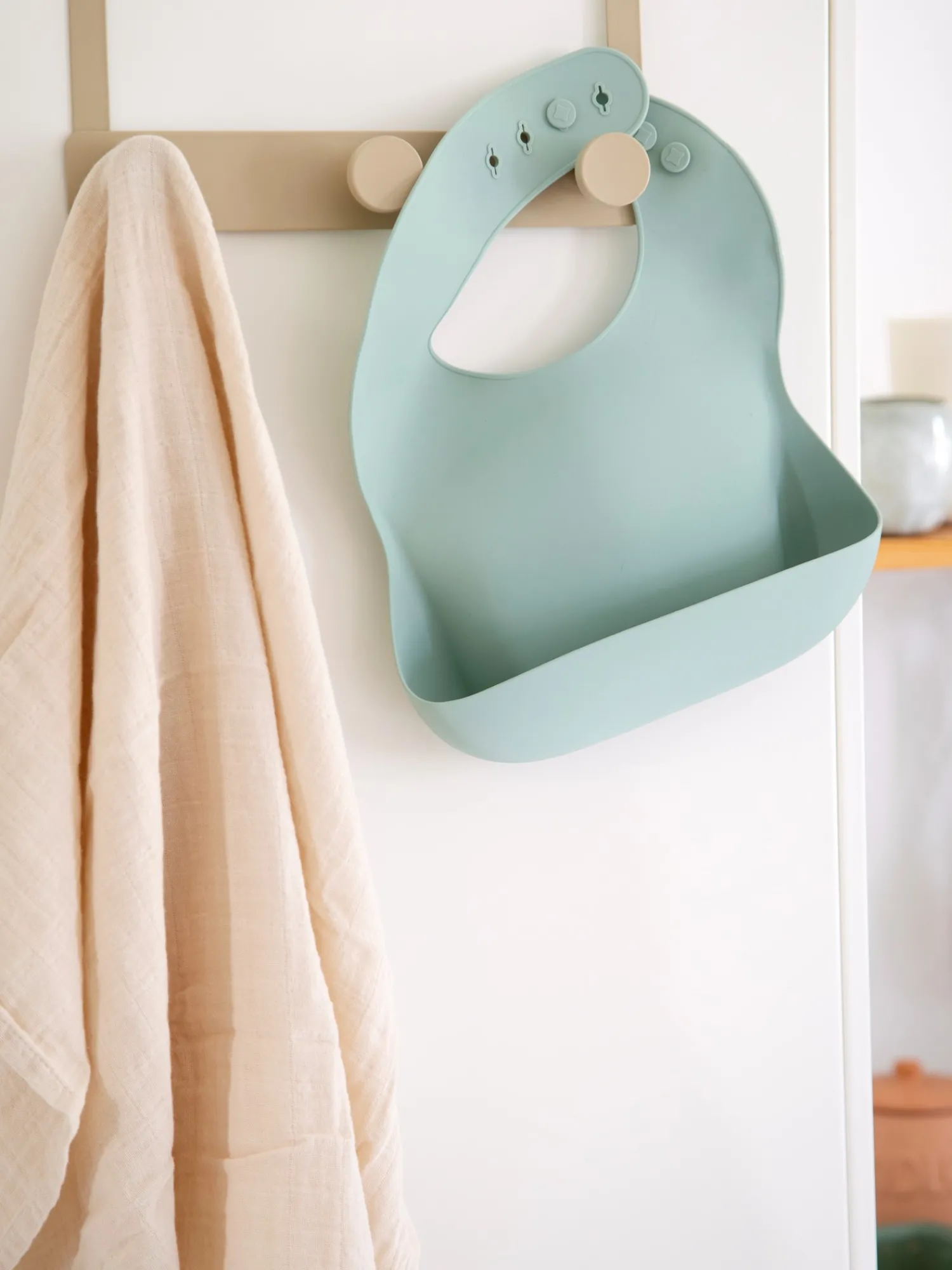 Denne silikonehagesmæk fra Mushie er lavet af fødevaregodkendt silikone. Den hjælper med at holde Deres barn og det omkringliggende område rent. Den dybe lomme fanger det meste af maden og mindsker rod på gulvet og på de kære smås tøj. De afrundede nakkelukninger sikrer en behagelig pasform.Søstrene anbefaler at rengøre den med varmt sæbevand før brug.Bemærk venligst, at produktet altid skal bruges under opsyn af en voksen. Undersøg produktet før hver brug. Afskaf ved tegn på skade eller svaghed.