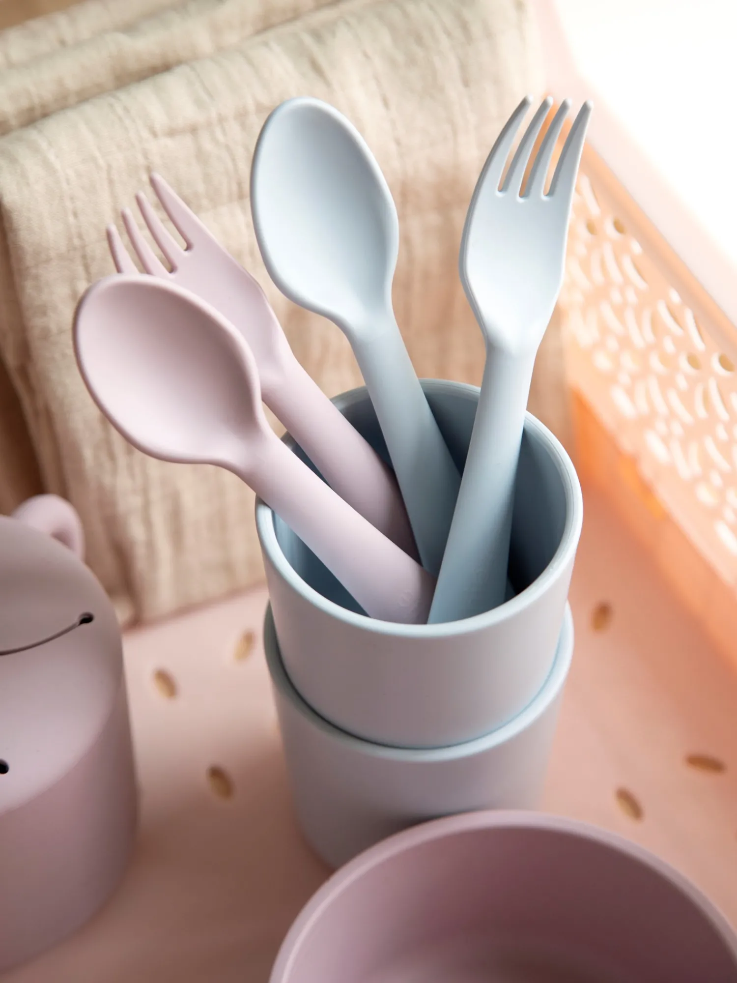 Ske og gaffel-sættet fra Mushie er enkelt og elegant. De er nemme at holde om for Deres barn. Dette sæt er fremstillet i Danmark og tåler opvaskemaskine, hvilket gør oprydningen lidt nemmere. Bemærk venligst, at produktet altid skal bruges under opsyn af en voksen. Undersøg produktet før hver brug. Afskaf ved tegn på skade eller svaghed.