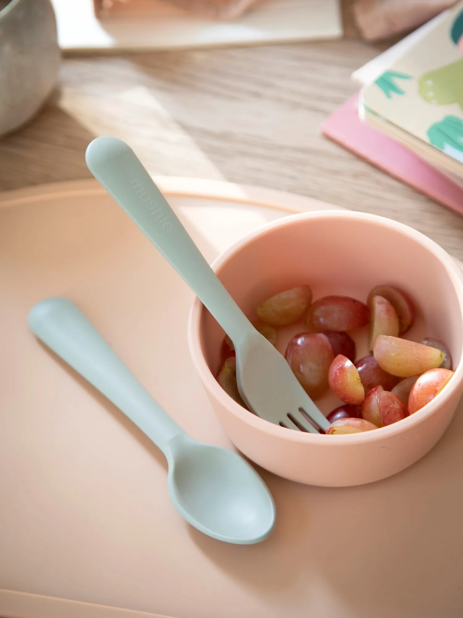 Ske og gaffel-sættet fra Mushie er enkelt og elegant. De er nemme at holde om for Deres barn. Dette sæt er fremstillet i Danmark og tåler opvaskemaskine, hvilket gør oprydningen lidt nemmere. Bemærk venligst, at produktet altid skal bruges under opsyn af en voksen. Undersøg produktet før hver brug. Afskaf ved tegn på skade eller svaghed.