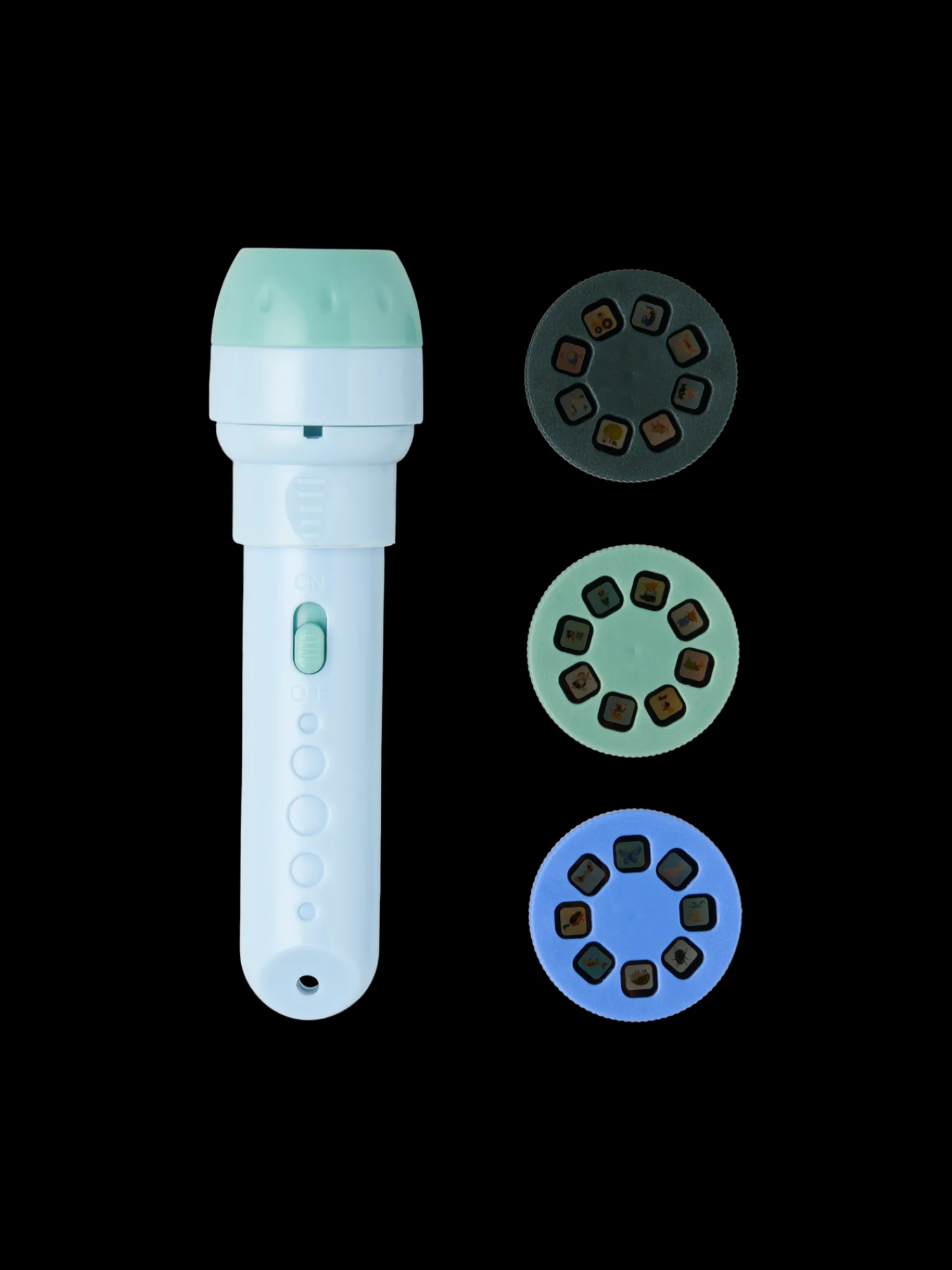 Søstrenes projektorlommelygte kommer med tre billedhjul med 8 forskellige billeder i hver.