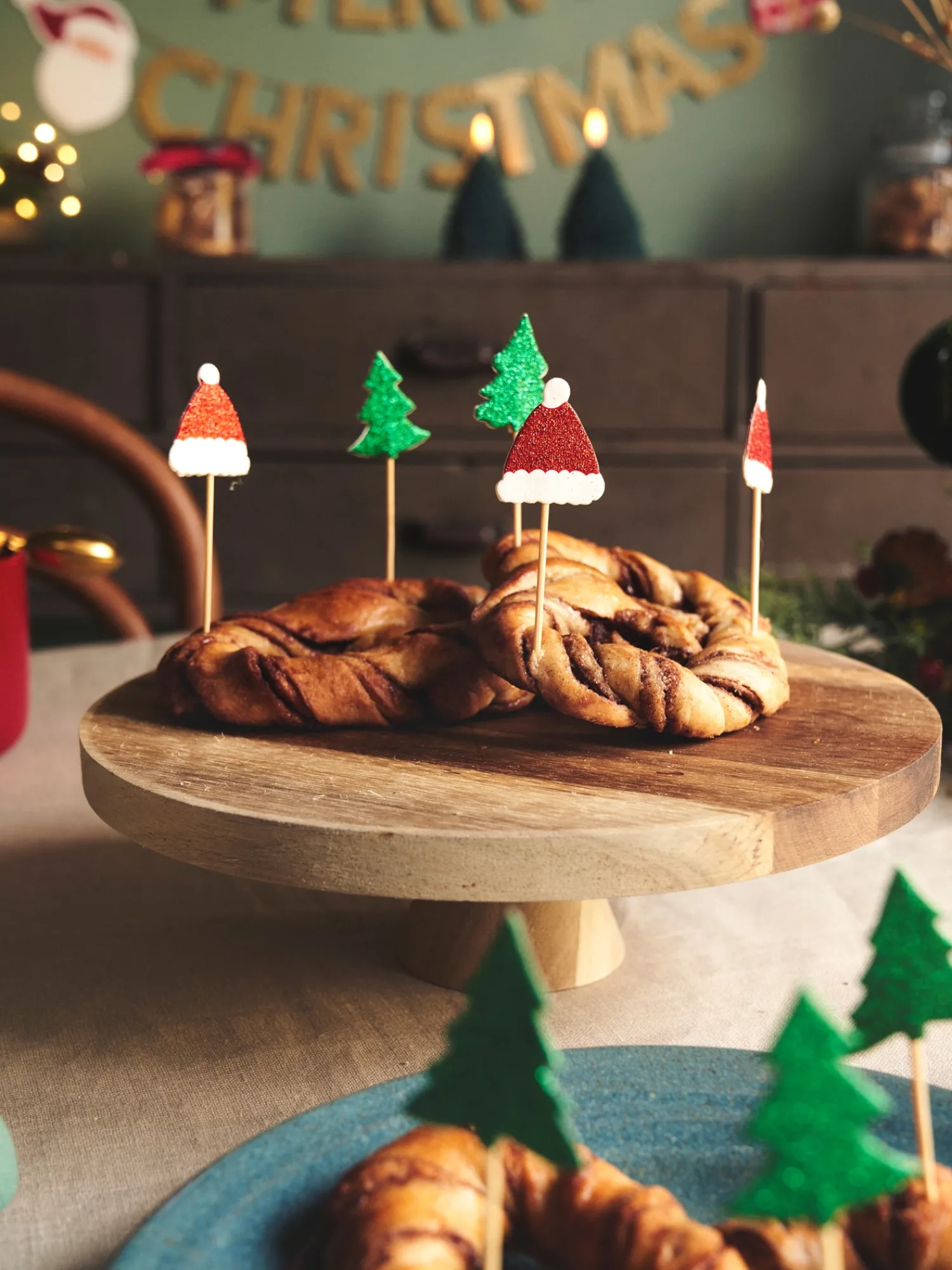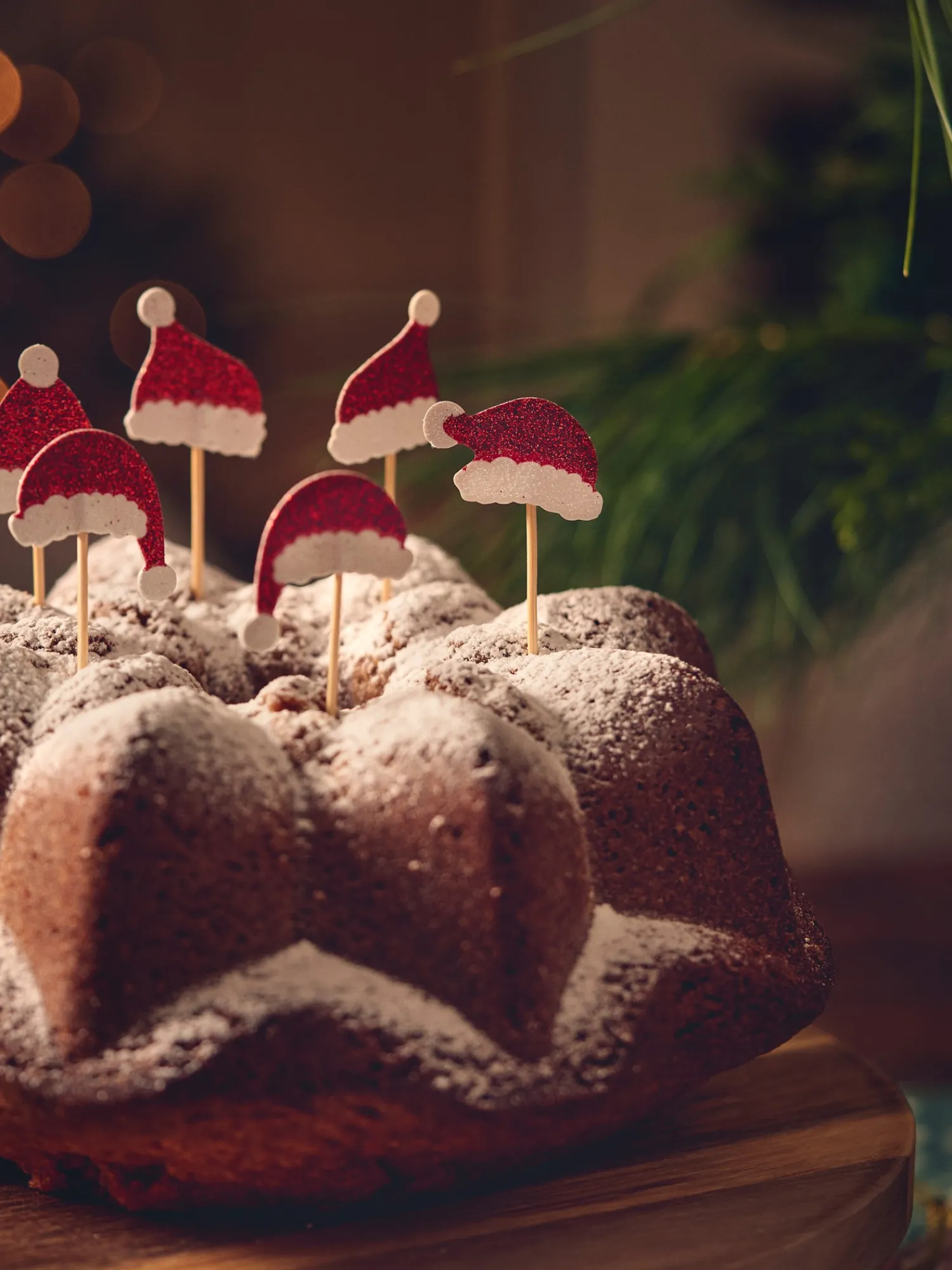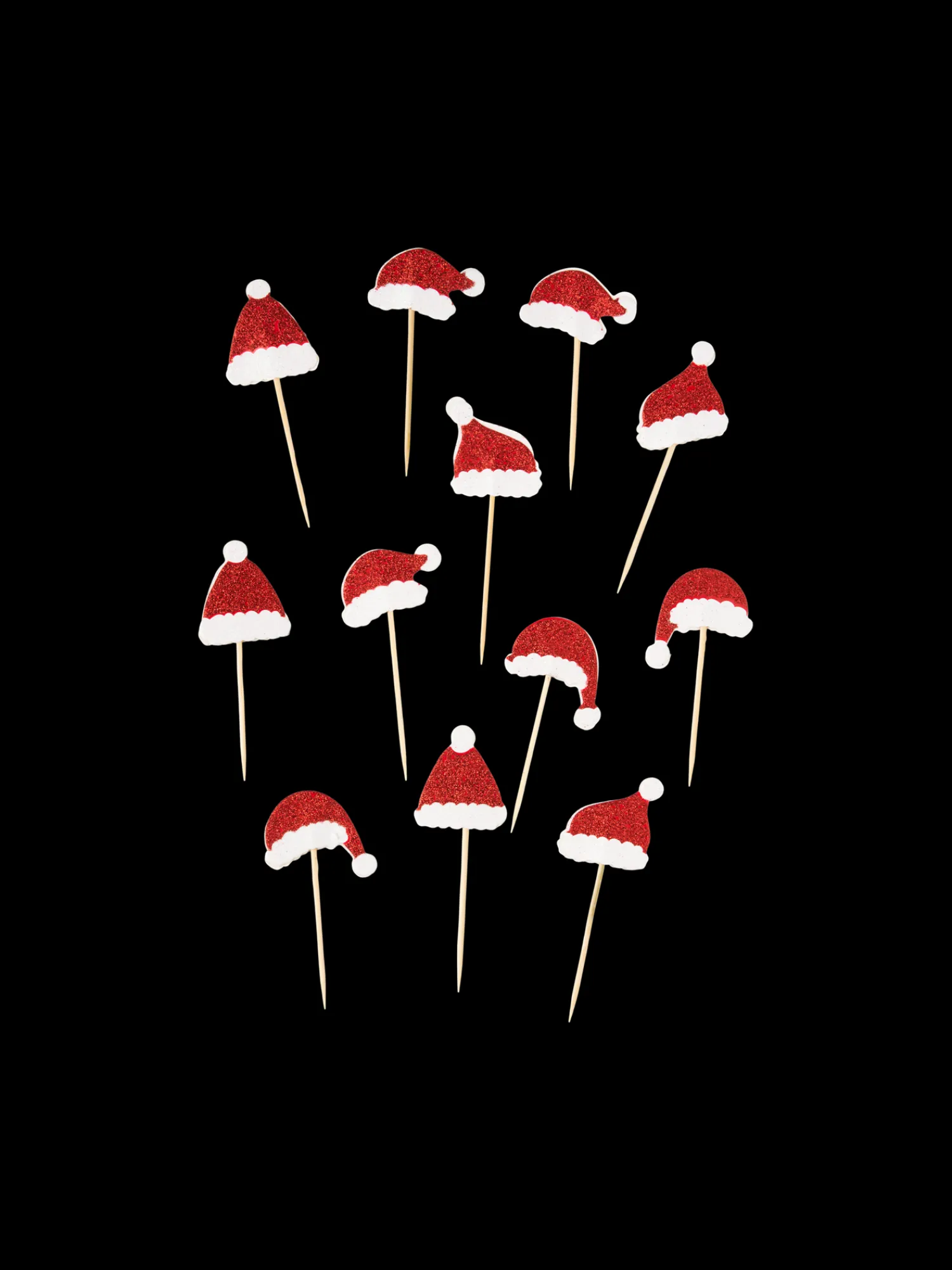 Søstrenes kagepynt er lavet af FSC®-certificeret papir og bambus og måler 3,5 x 4 cm. En pakke indeholder 12 små nissehuer på pinde.
