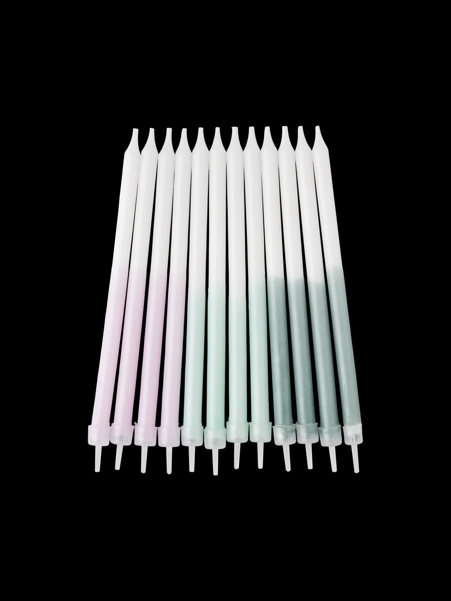 Søstrenes kagelys kommer i et sæt med 12 lys og 12 gennemsigtige lysestager.