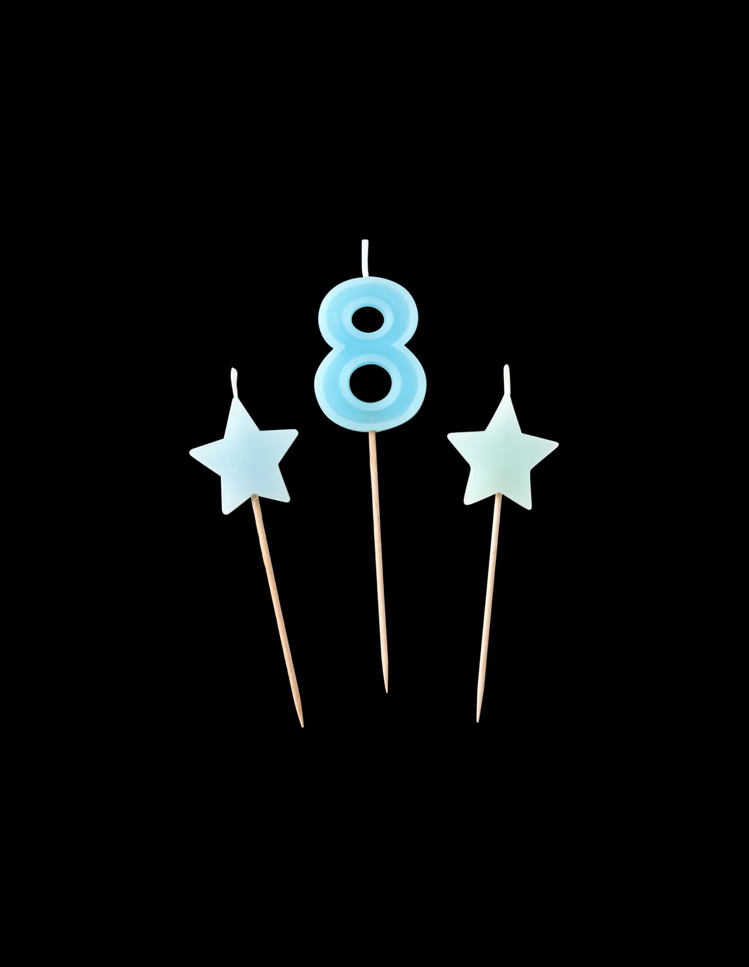 Søstrenes kagelys er lavet af paraffin, og hver pakke indeholder et tallys samt to stjerneformede lys. Tallet ‘8’ måler 11,5 x 3 cm, og de to stjerner måler hver 9 x 3 cm. Alle tre stearinlys kommer med et spyd, der måler 7 cm i længden. “Skønheden ligger i detaljerne,” som Anna og Clara gerne siger.