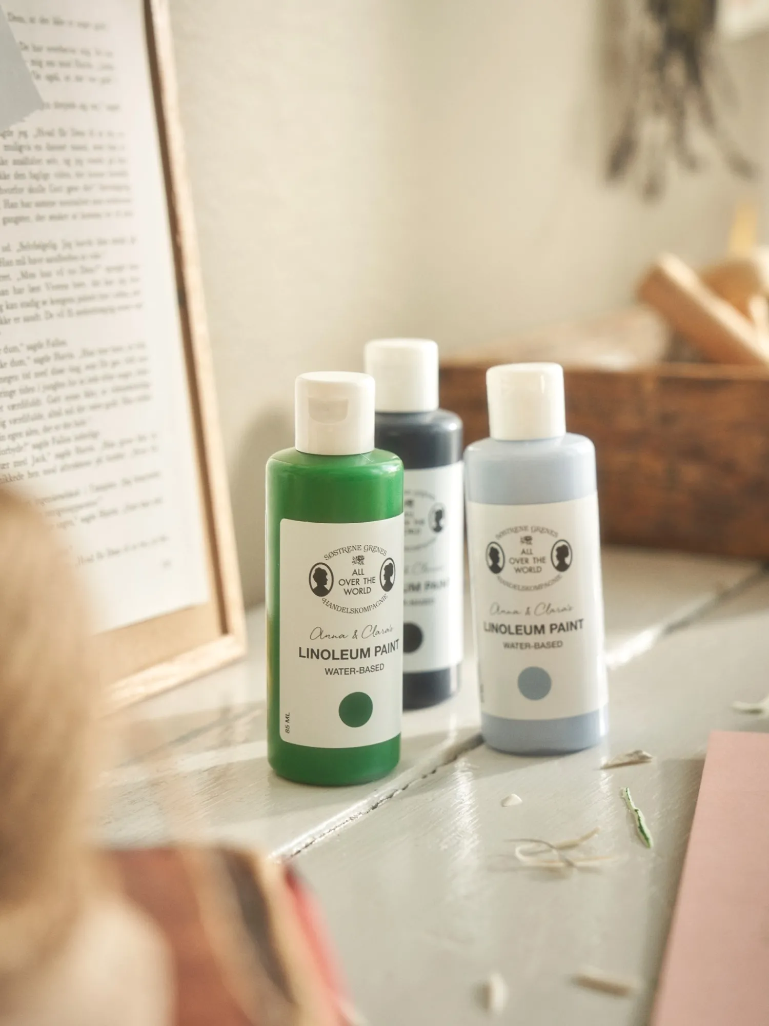 Søstrenes maling til linoleumstryk er vandbaseret og fremstillet i Danmark.