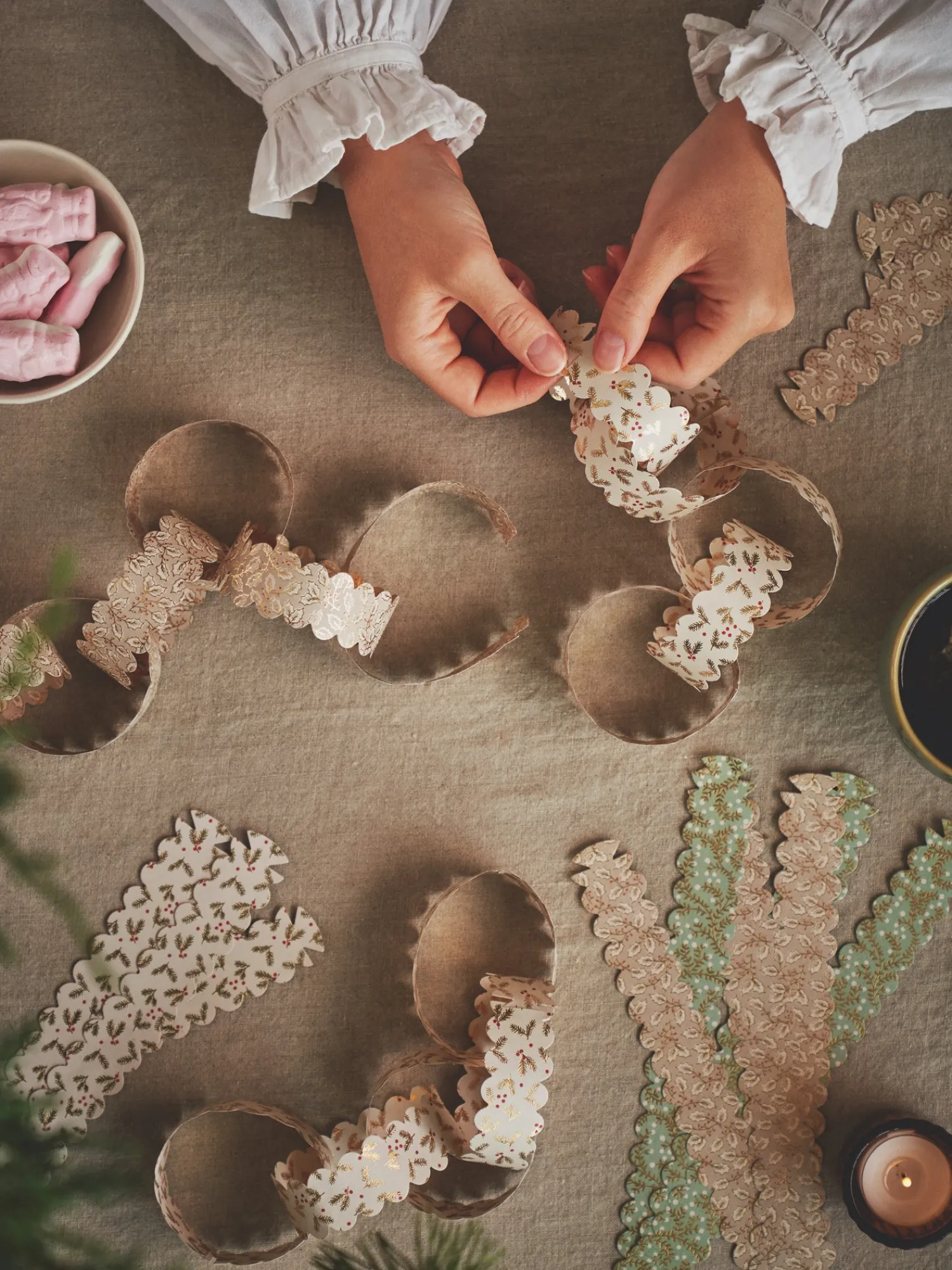 Søstrenes guirlandestrimler er lavet af FSC®-certificeret papir. En pakke indeholder 48 strimler til at kunne lave en dejlig og festlig guirlande.
