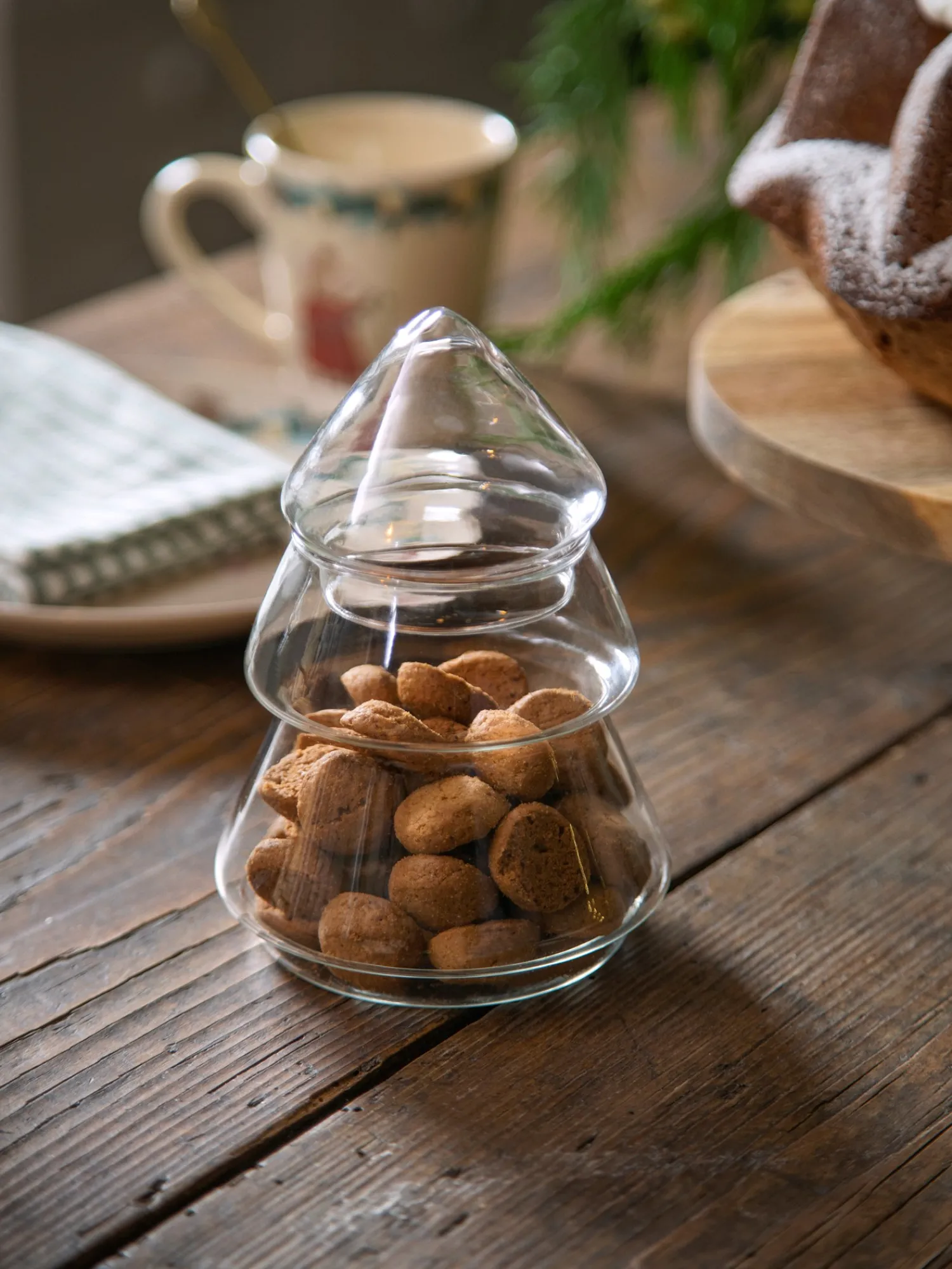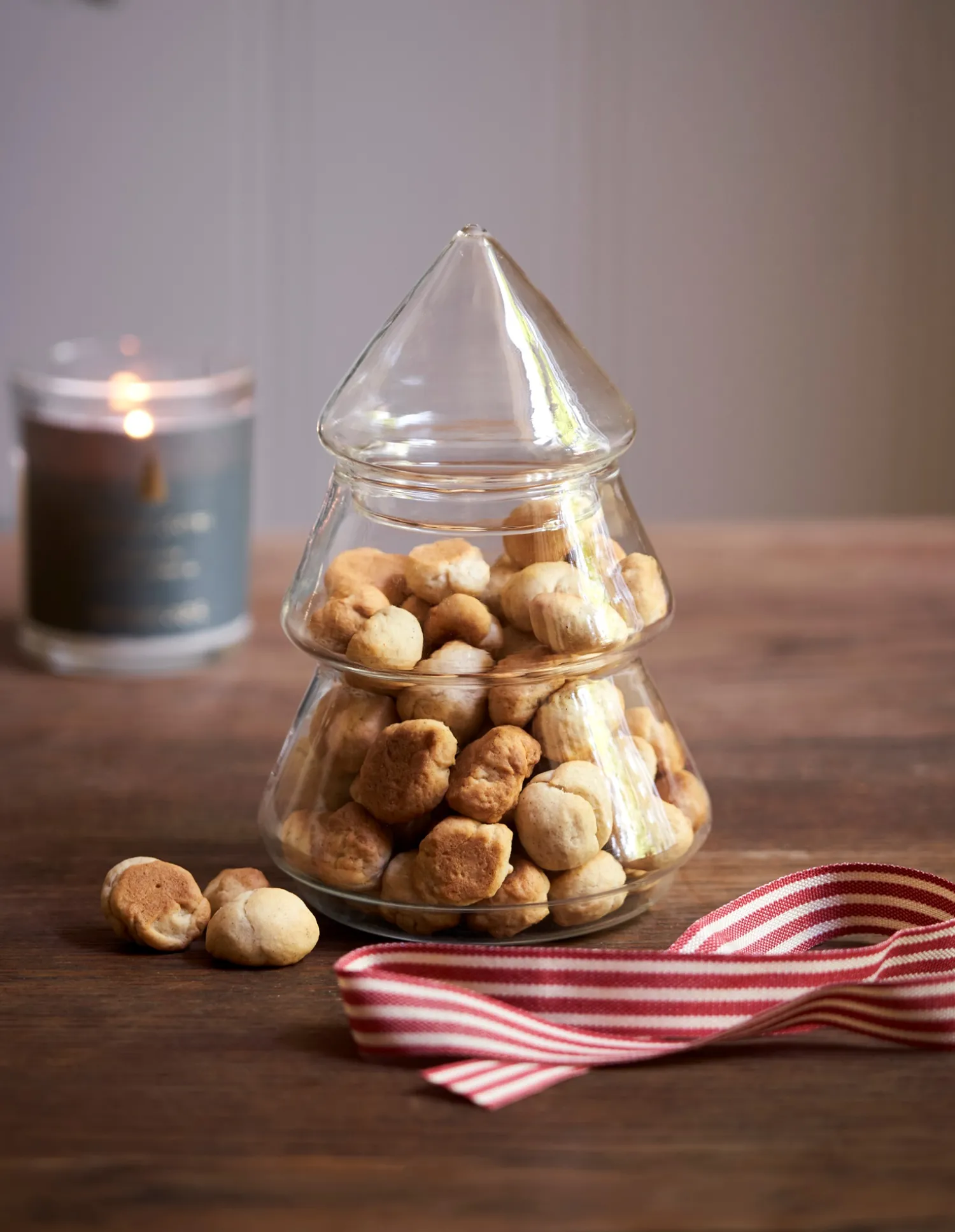 Søstrenes træformede krukke er lavet af glas og kan være en festlig måde at opbevare julegodter på.