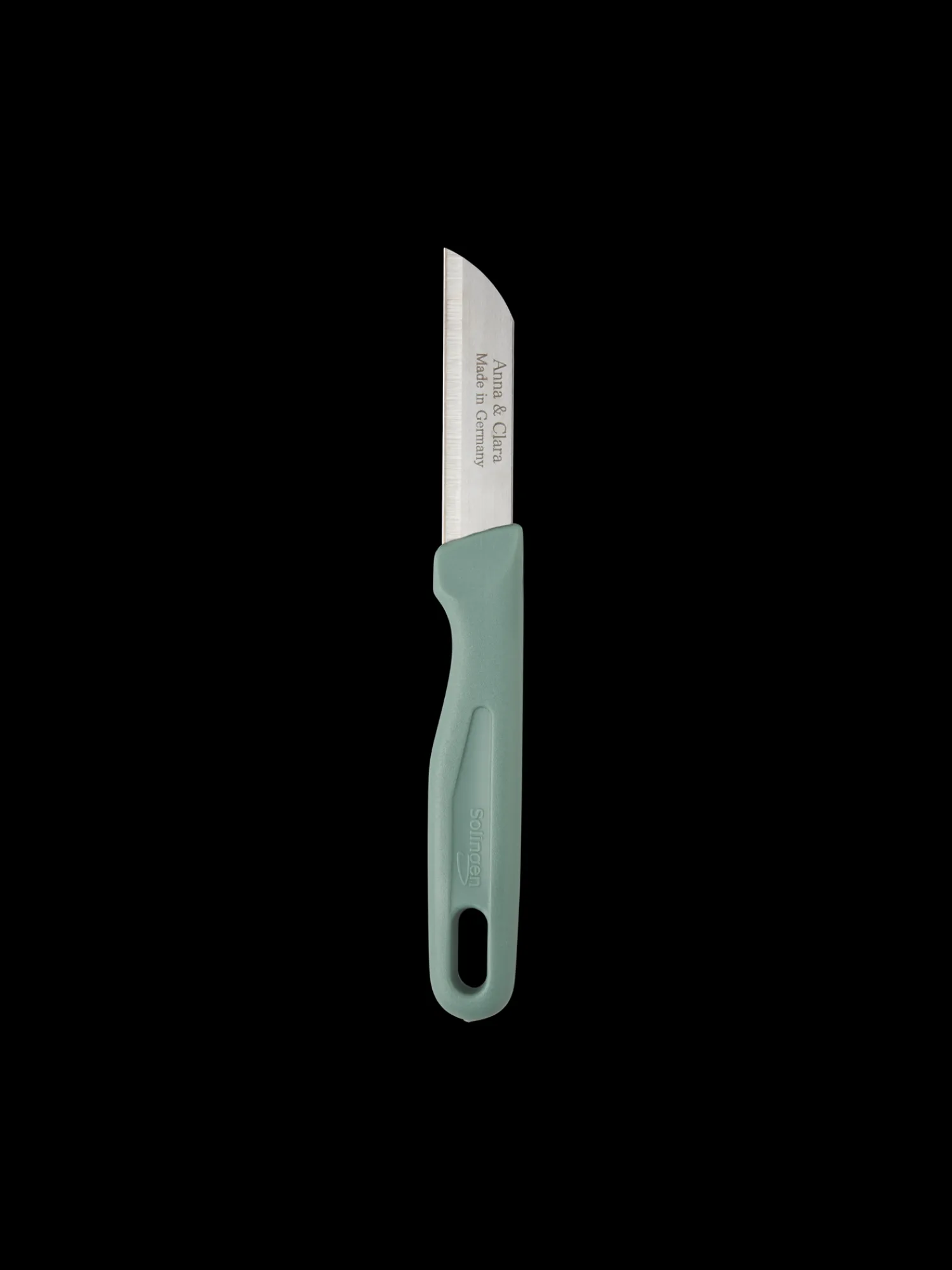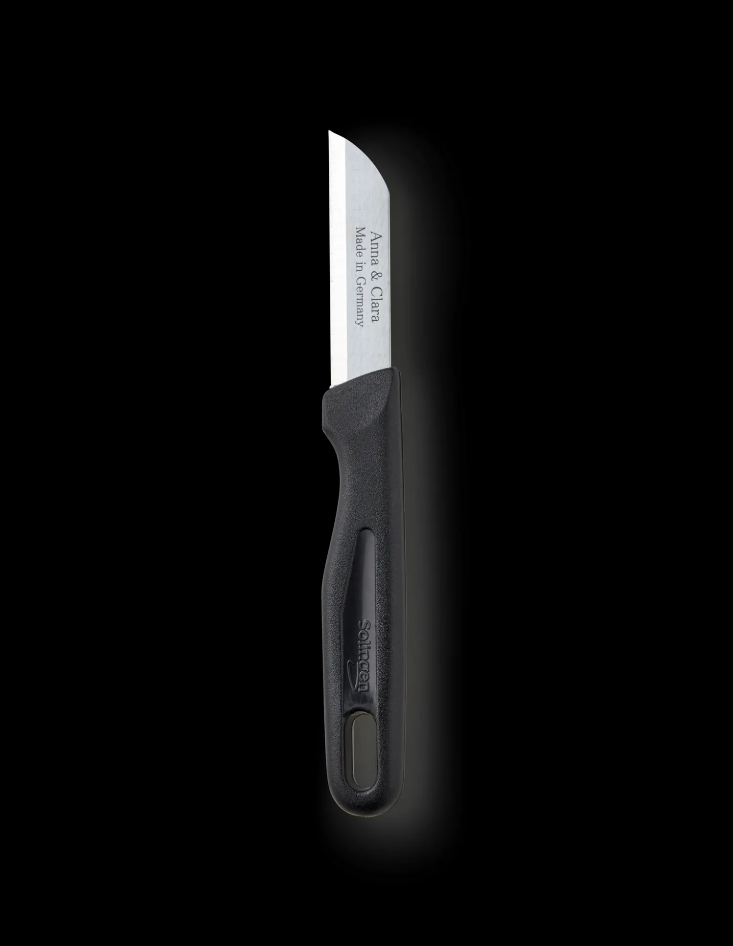 Anna og Claras urtekniv måler 16 cm i længden og 2 cm i bredden. Den er lavet i Tyskland af plast og rustfrit stål.