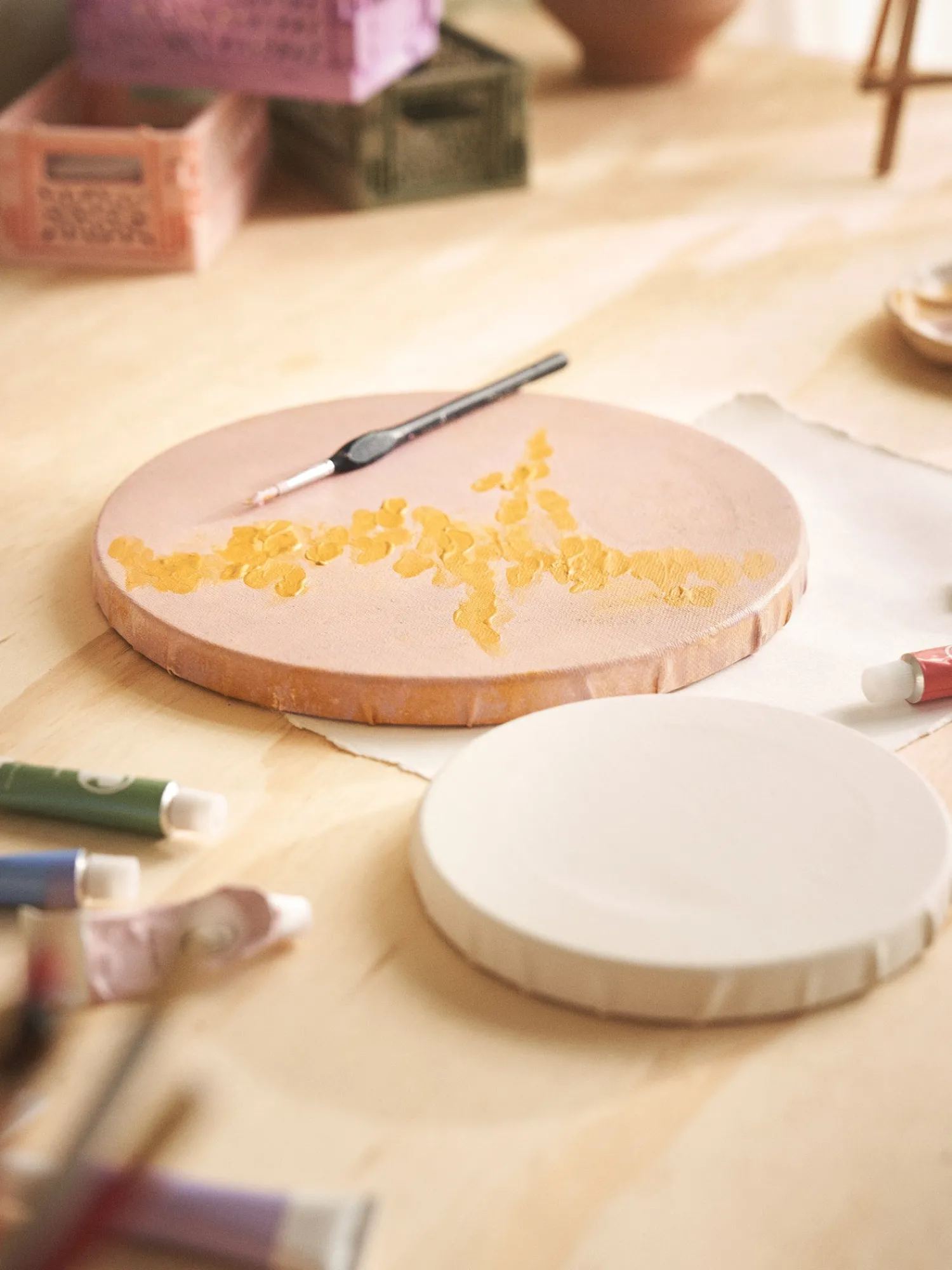 Søstrenes lærred er lavet af bomuld og FSC®-certificeret MDF. Det er rundt og måler 25 cm i diameter.