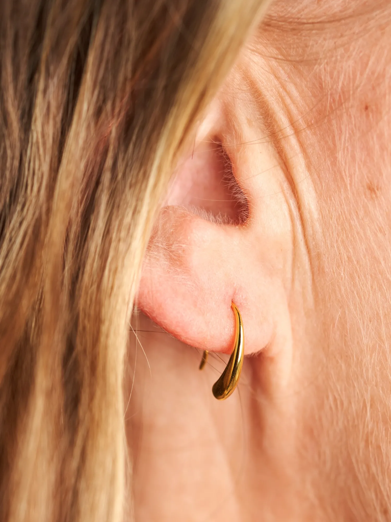 Søstrene gør Dem venligst opmærksom på, at denne vare kun forhandles online. Amy-øreringene er lavet af 925 sterling sølv og forgyldt med 18 karat guld. Disse to øreringe måler 8 x 3 x 14 mm og kommer i en smuk, lille smykkeæske.”Amy-øreringene har en blød, rund facon, hvilket er et nyt strejf til de klassiske creoler,” siger Clara med et smil. “En oplagt tilføjelse til Deres smykkesamling.”Anna og Clara gør Dem venligst opmærksom på, at De bør undgå direkte kontakt med fugt og væske for en længere holdbarhed af guldbelægningen.