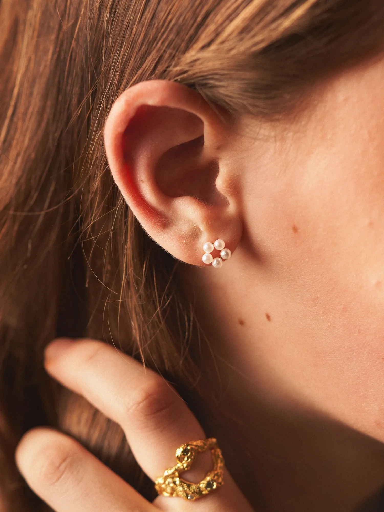 Phine Pearl Flower-øreringene fra det danske brand AndCopenhagen er lavet af 925 sterlingsølv, belagt med 18 karat guld, og har små fine plastikperler. De to øreringe måler 7 mm i diameter og kommer i en smuk, lille smykkeæske.Anna og Clara gør Dem venligst opmærksom på, at smykket bør undgå direkte kontakt med fugt og væske, så guldbelægningen får en længere holdbarhed.