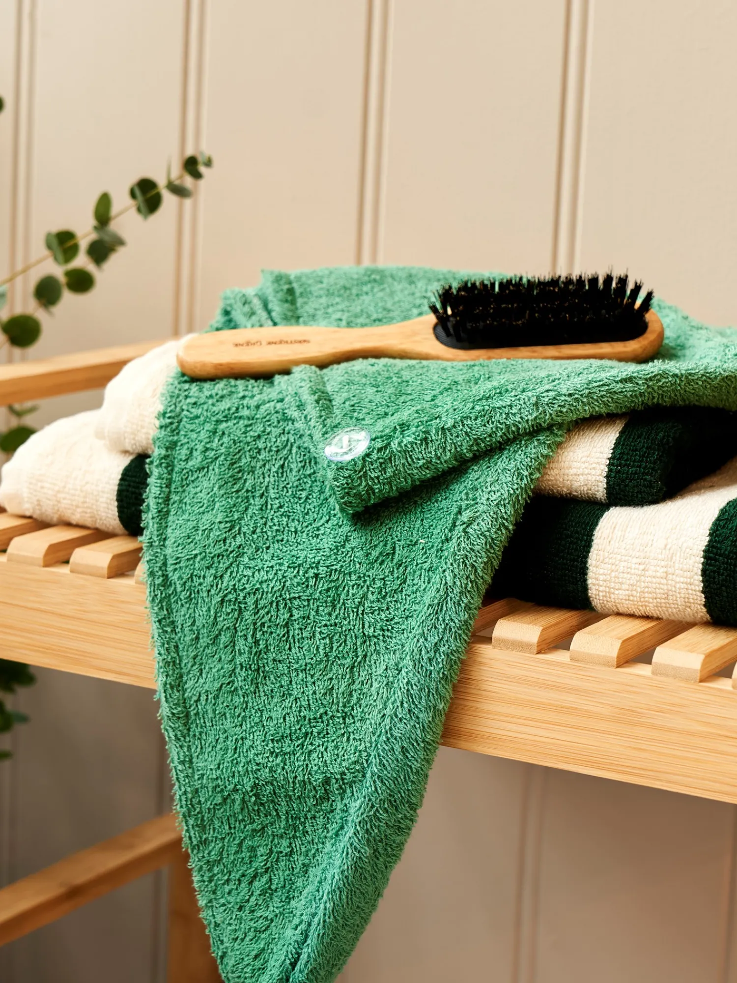 Søstrenes håndklæde til hår er lavet af STANDARD 100 by OEKO-TEX®-certificeret* bomuld. “Pak Deres hår ind i et skønt håndklæde som dette for at få en ægte spa-dag,” anbefaler Anna med et smil.*23.HCN.63671 HOHENSTEIN HTTI
