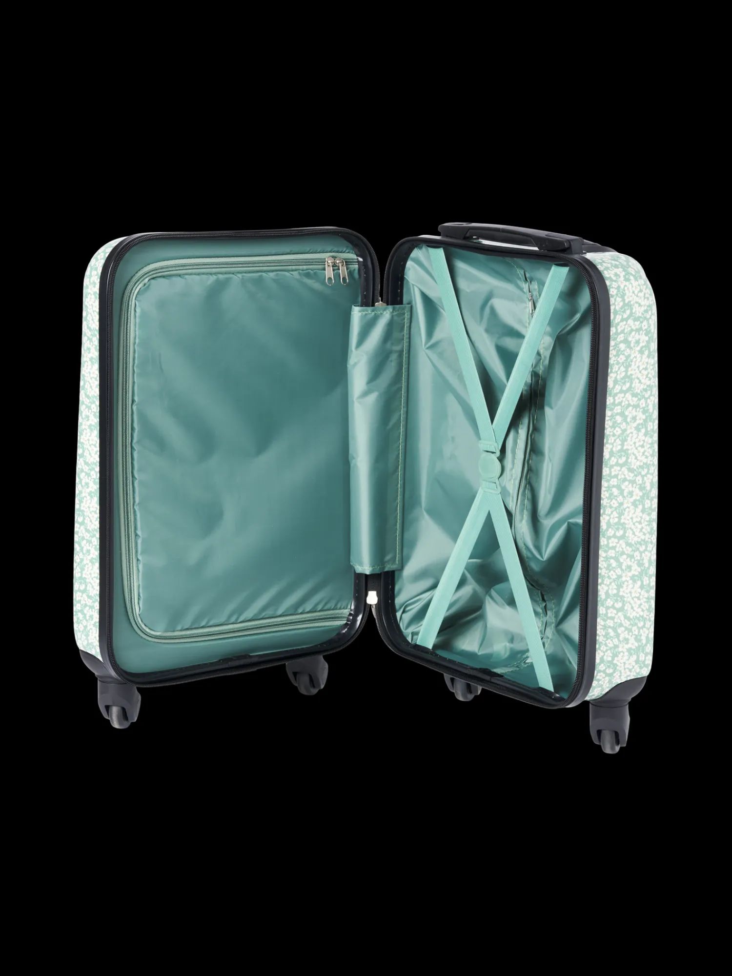 Søstrenes hardcase kabinekuffert har fire hjul og lynlås på indersiden. Den har også et elastikbånd, som holder Deres tøj på plads, når De rejser.