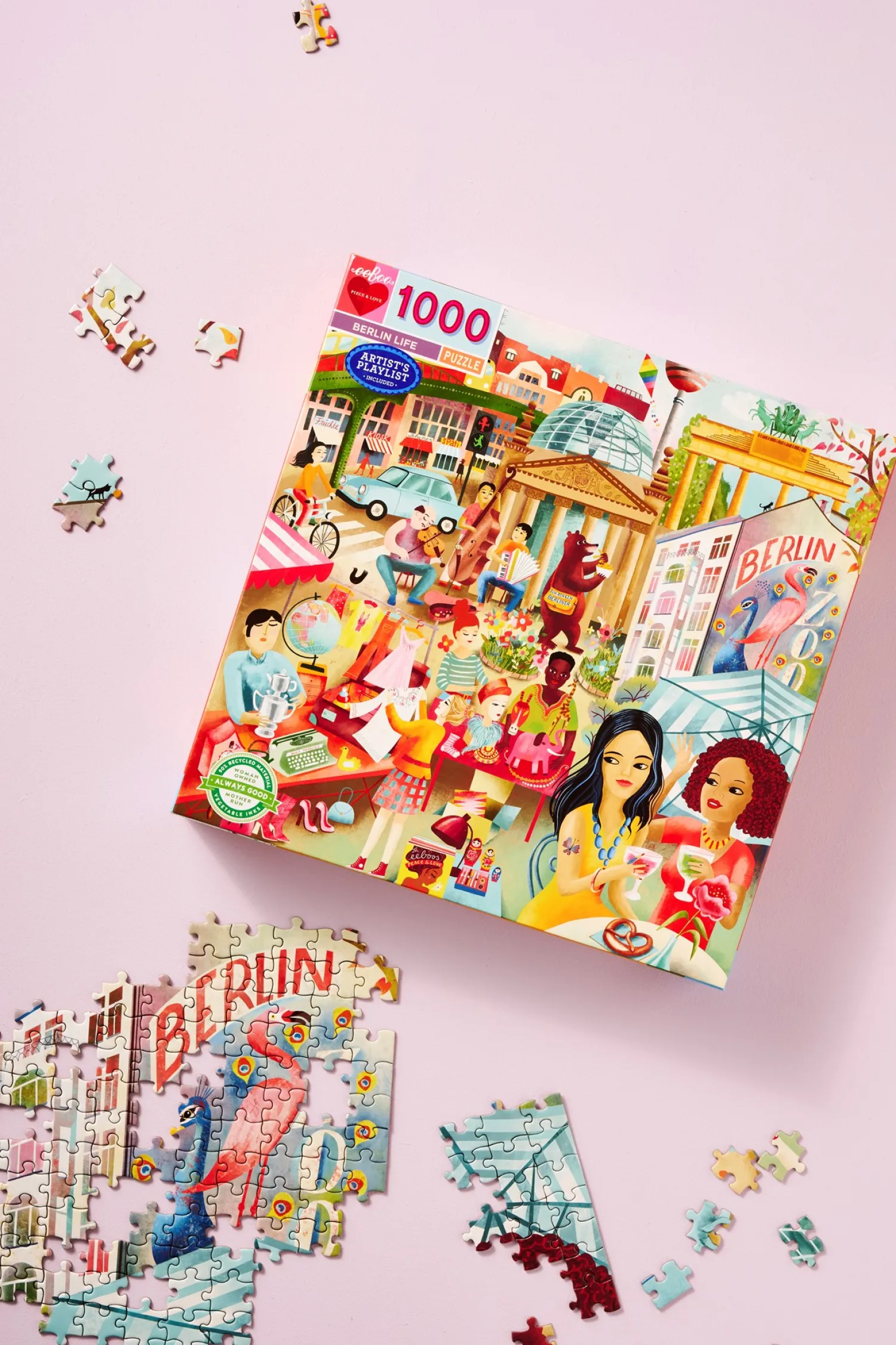 Søstrene gør Dem venligst opmærksom på, at denne vare kun forhandles online.Berlin Life-puslespillet fra eeBoo er lavet af papir og måler 58,4 x 58,4 cm, når det er samlet. Puslespillet har 1000 brikker. Illustrationen er af Uta Krogmann.Hvad end de hygger sig indenfor på regnvejrsdage eller sidder på terrassen, når solen skinner, finder Anna og Clara stor fornøjelse i at lægge puslespil sammen. “Det er en beroligende aktivitet, som giver masser af plads til at småsnakke, alt imens man lægger puslespillet,” siger Clara.Hun samler metodisk brikkerne, der danner en ramme om puslespillet, mens Anna forsøger at finde farver og former, der lader til at passe sammen. De har hver deres tilgang til at lægge puslespil, og sammen tilbringer de en eftermiddag, hvor de harmonisk arbejder sammen. “Det er altid en stor glæde, når det endelige resultat afsløres, og man kan fordybe sig i de skønne små detaljer i billedet,” siger Anna med et smil.