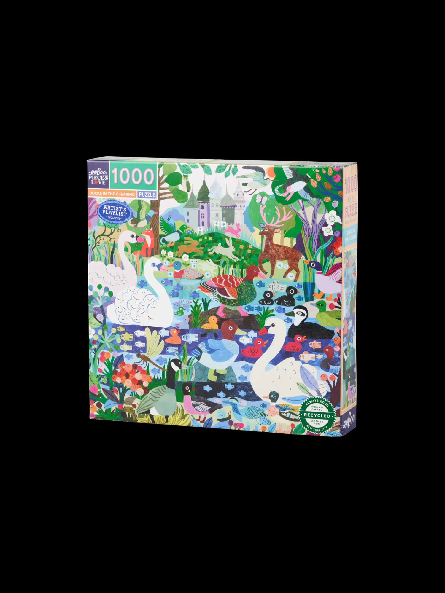 Ducks in the Clearing-puslespillet fra eeBoo er lavet af papir og måler 58,4 x 58,4 cm, når det er samlet. Puslespillet har 1000 brikker. Illustrationen er af Monika Forsberg.