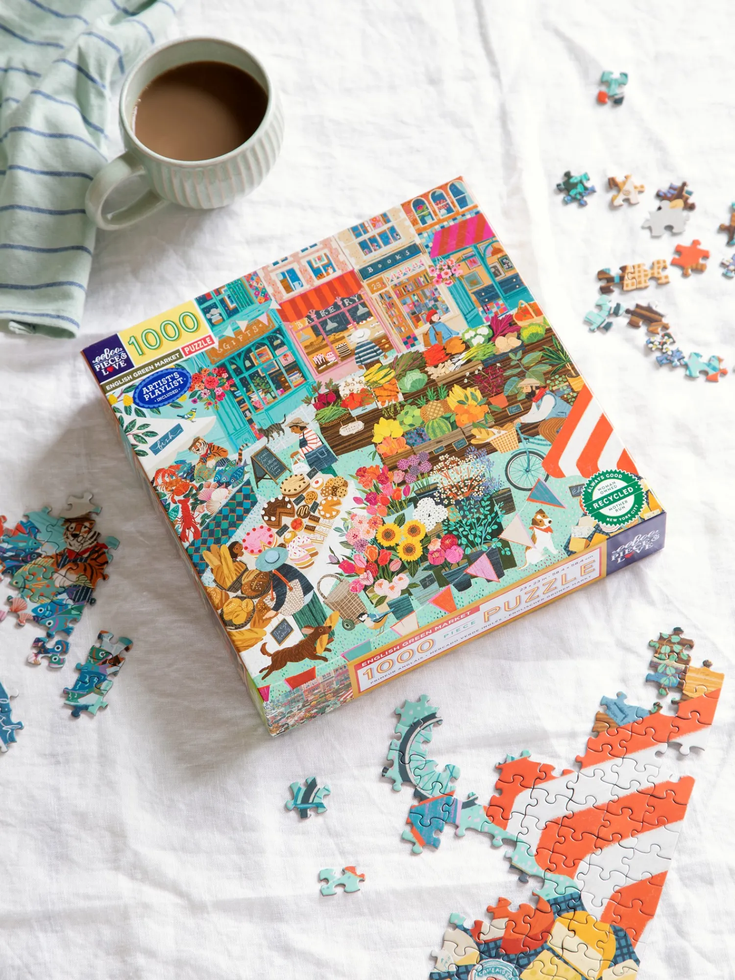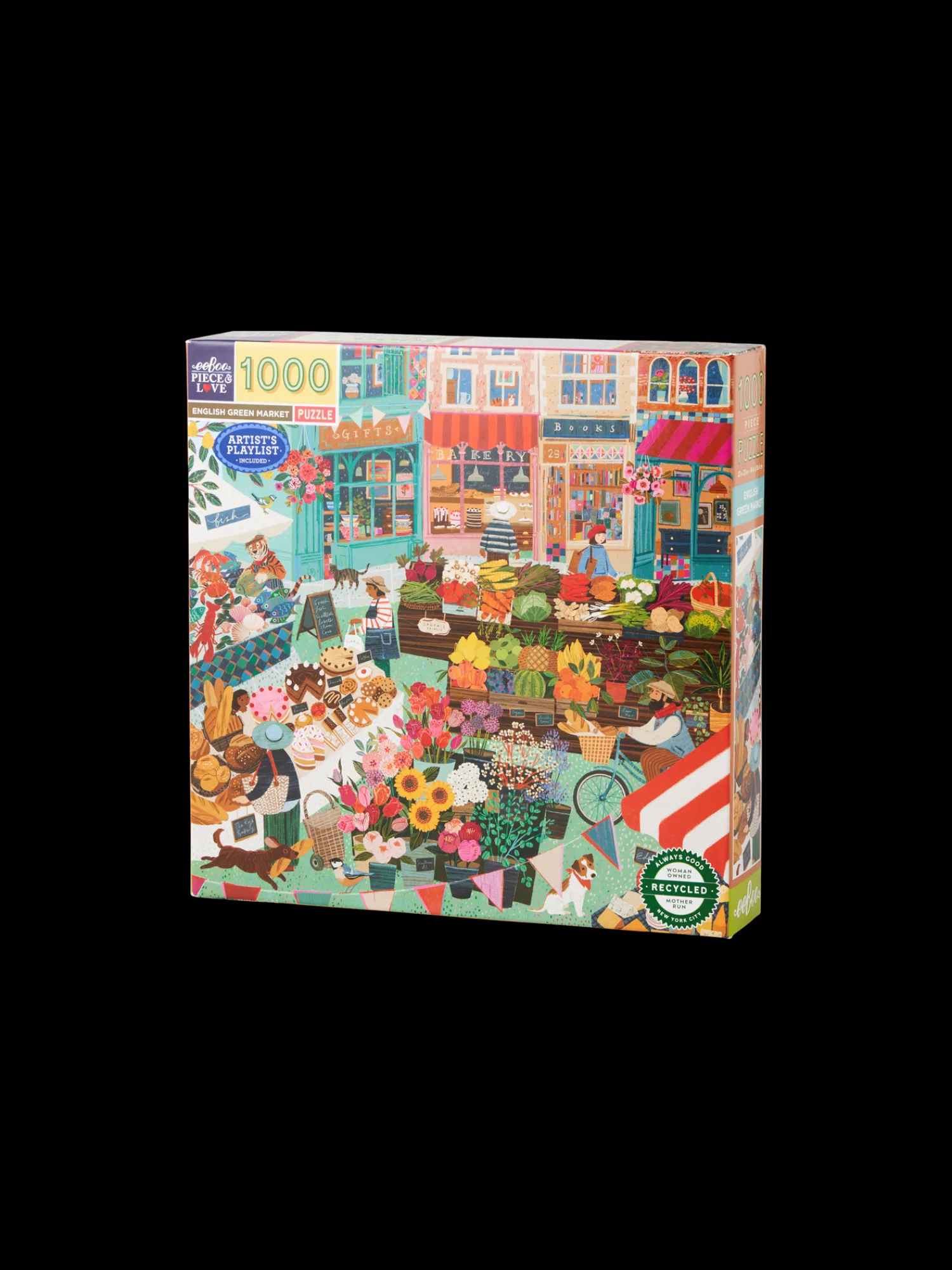 English Green Market-puslespillet fra eeBoo er lavet af papir og måler 58,4 x 58,4 cm, når det er samlet. Puslespillet har 1000 brikker. Illustrationen er lavet af Victoria Ball.
