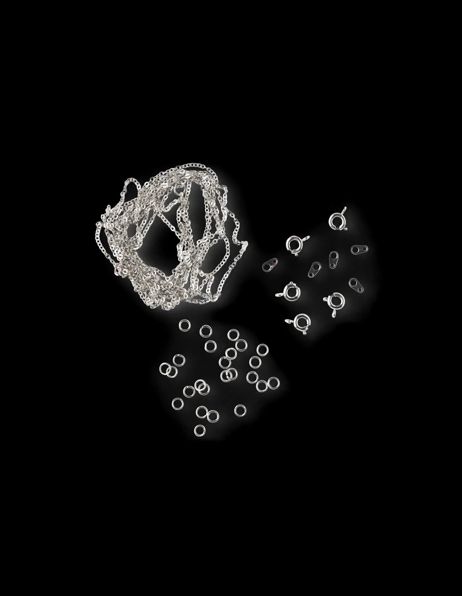 Søstrenes smykkeredskaber indeholder 5 sæt låse, 25 stk af 4 mm O-ringe og en 150 cm lang kæde.