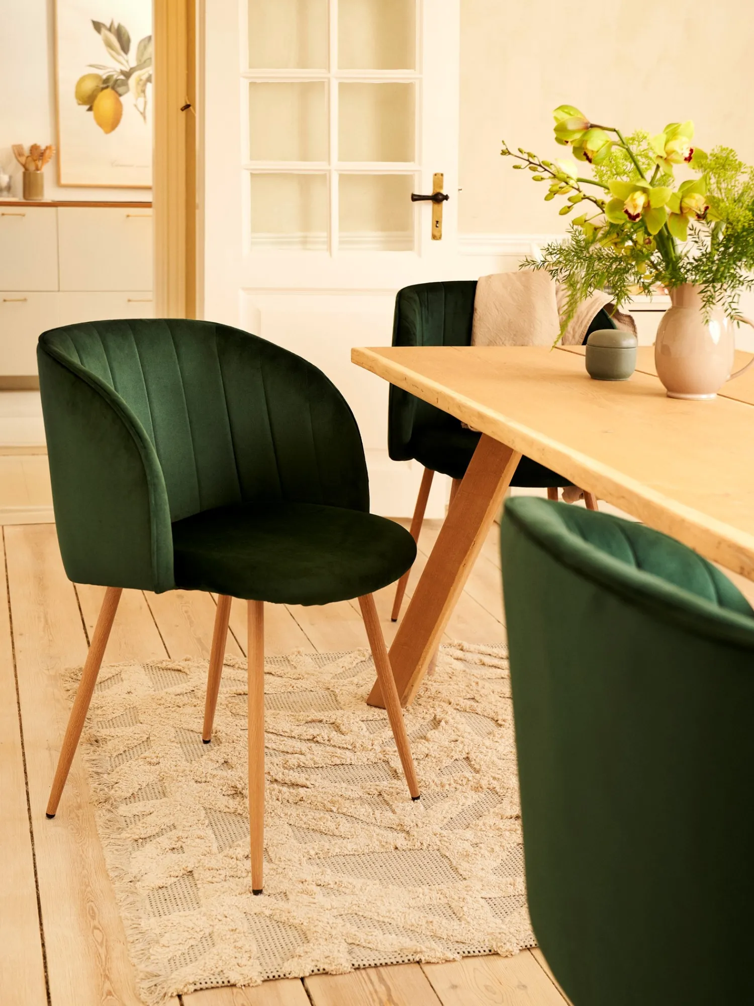 Søstrenes stol er lavet af STANDARD 100 by OEKO-TEX®-certificeret* polyester samt metal og polyurethan, og den måler D50 x B42,5 x H81 cm. Den har en siddehøjde på 49,5 cm og en siddedybde på 47 cm.Søstrenes stol, ‘Anna’, har en skøn fløjlspolstring, der ville se vidunderlig ud ved Deres spisebord, på Deres hjemmekontor eller som et iøjnefaldende element i Deres læsehjørne. Kombinationen mellem stoffets struktur og de slanke metalben giver stolen et elegant udtryk.*SH040 191228 TESTEX