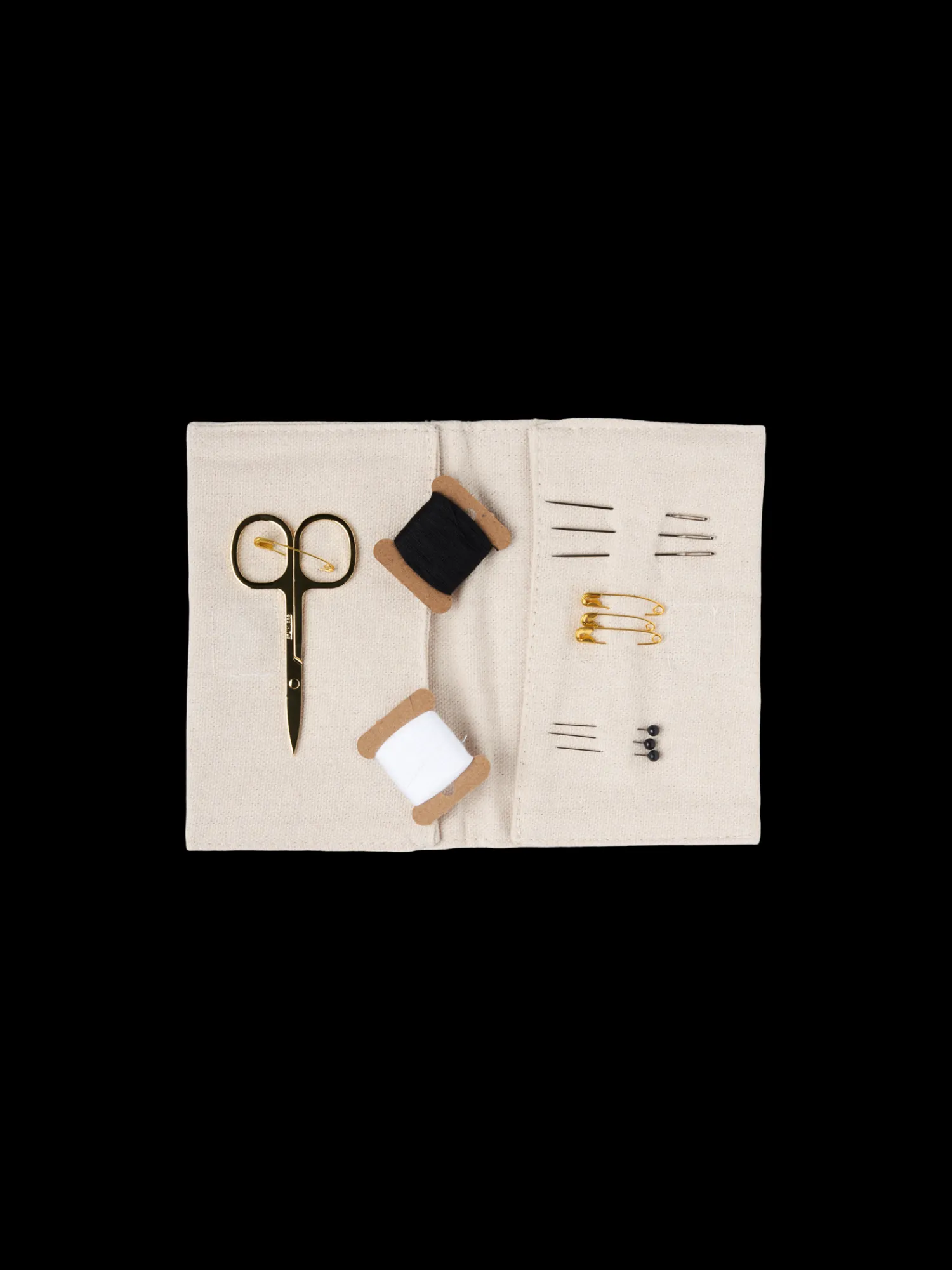 Søstrenes sysæt består af en saks, sort og hvid tråd, tre synåle, tre sikkerhedsnåle og to forskellige slags knappenåle.