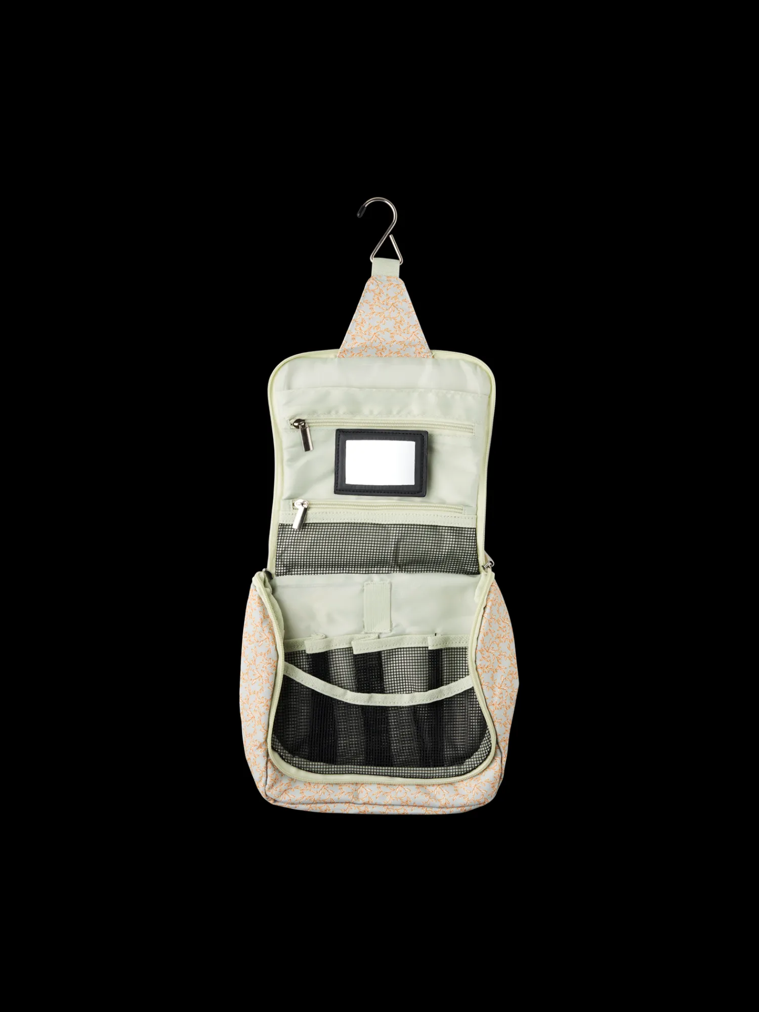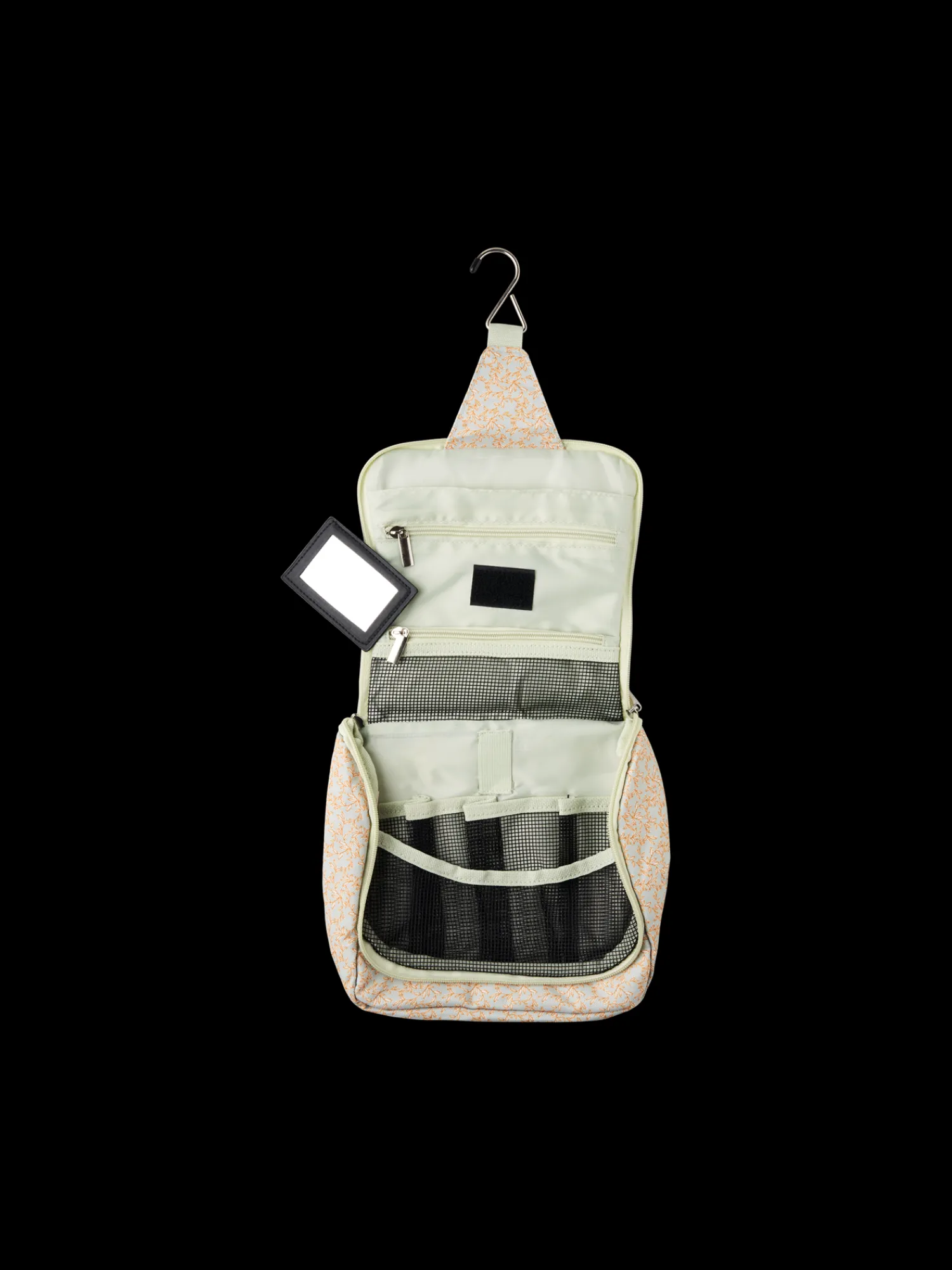 Søstrenes toilettaske er lavet af polyester og har nylonkomponenter. Den har en lille løkke øverst til ophængning, og når den foldes ud, måler den 40 cm.
