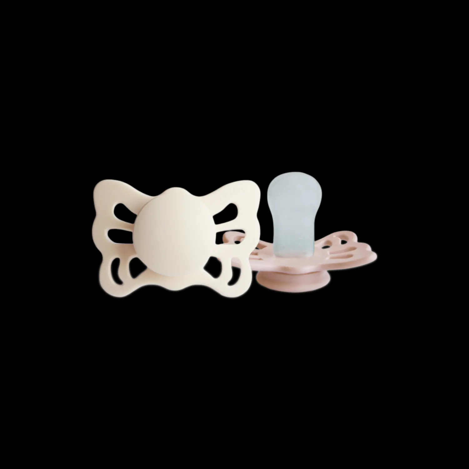 Butterfly-sutterne fra det danske mærke FRIGG er designet og produceret i Danmark. Pakken indeholder 2 FRIGG-sutter. Sutterne har låsemekanismen click-lock® og en ny SilkySoft™ overflade. Sutten er lavet af medicinsk silikone og kommer i en størrelse 1, ideel til alderen 0-6 måneder. Sutten har en anatomisk form og måler 27 mm. Butterfly-sutterne fra FRIGG har form som en sommerfugl. Denne pakke indeholder en Cream-farvet sut og en Blush-farvet sut. Søstrene gør opmærksom på, at sutterne bør udskiftes hver 4.-8. uge af hygiejniske årsager og for optimal sikkerhed. De bør altid tjekke sutten før brug og kassere den ved første tegn på beskadigelse eller slid.