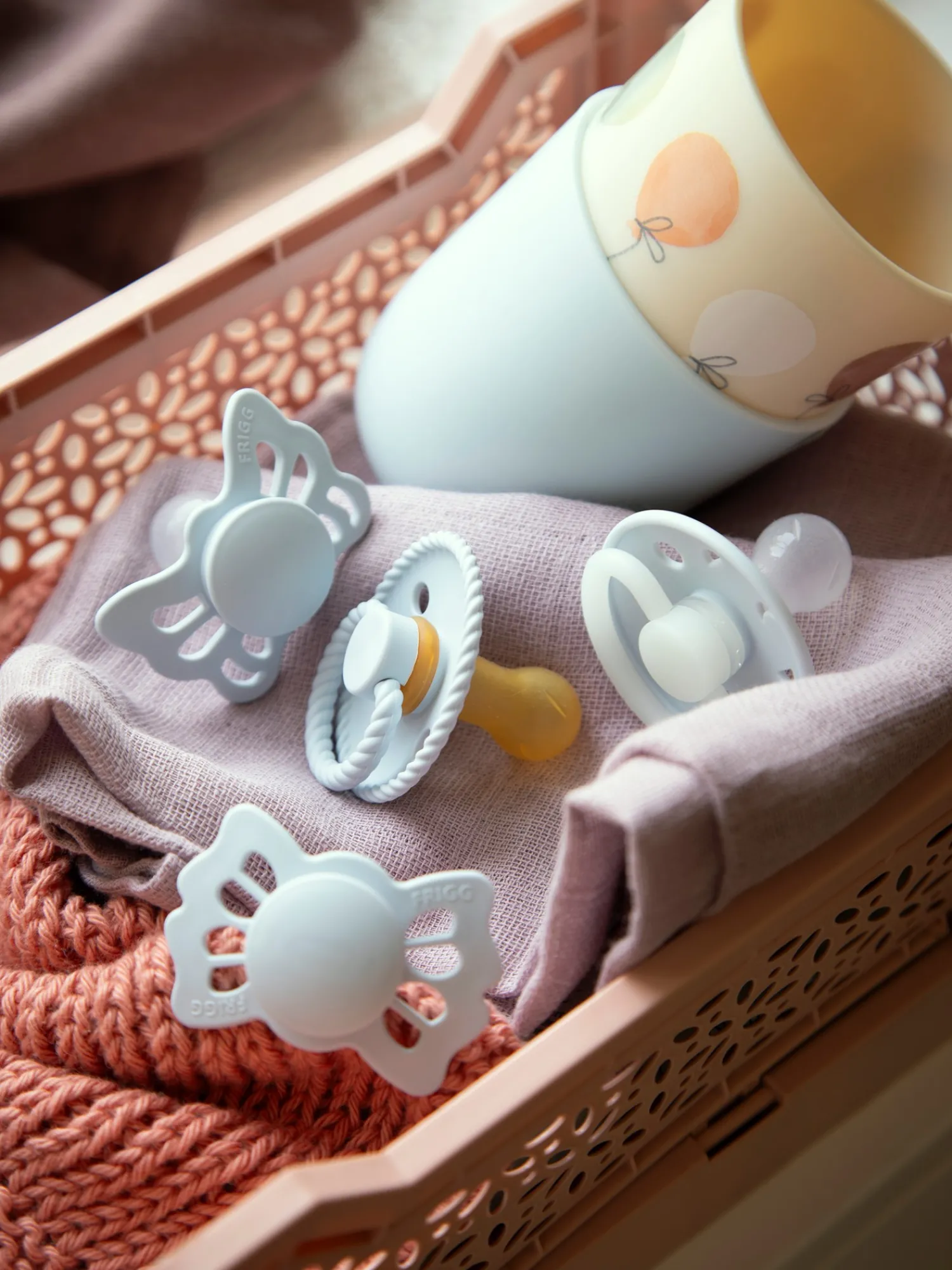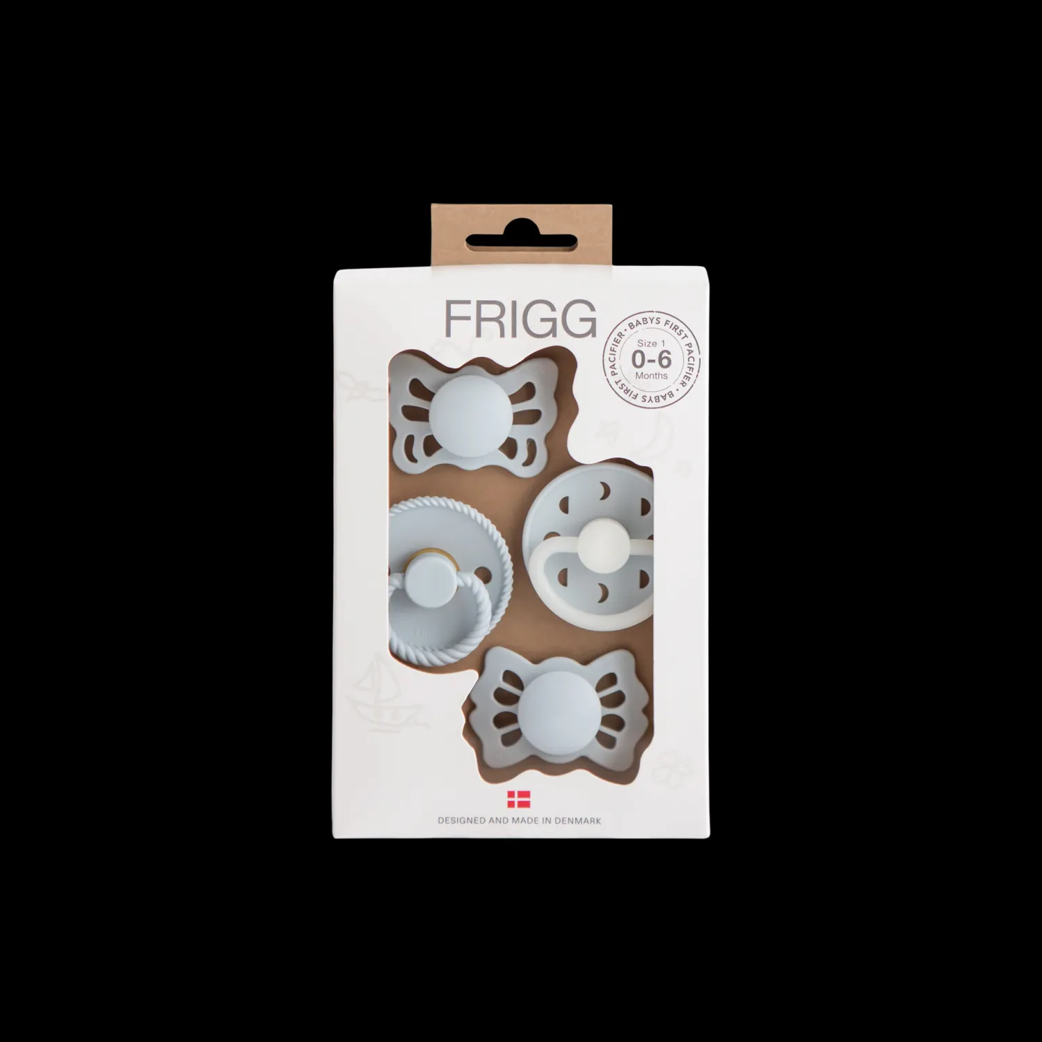 Dette sæt sutter fra det danske mærke FRIGG er designet og produceret i Danmark. Pakken indeholder 4 FRIGG-sutter: • 1 x Butterfly (anatomisk sut lavet af medicinsk silikone)• 1 x Fairytale (rund sut af naturgummi)• 1 x Daisy (rund sut lavet af medicinsk silikone)• 1 x Lucky (symmetrisk sut lavet af medicinsk silikone) Sutterne har låsemekanismen click-lock® og en ny SilkySoft™ overflade. Sættet, der består af 4 forskellige FRIGG-sutter med forskellige materialer og faconer, giver forældre mulighed for at prøve forskellige sutter for at finde ud af, hvilken deres baby bedst kan lide. Alle fire sutter kommer i en størrelse 1, ideel til alderen 0-6 måneder. Søstrene gør opmærksom på, at sutterne bør udskiftes hver 4.-8. uge af hygiejniske årsager og for optimal sikkerhed. De bør altid tjekke sutten før brug og kassere den ved første tegn på beskadigelse eller slid.