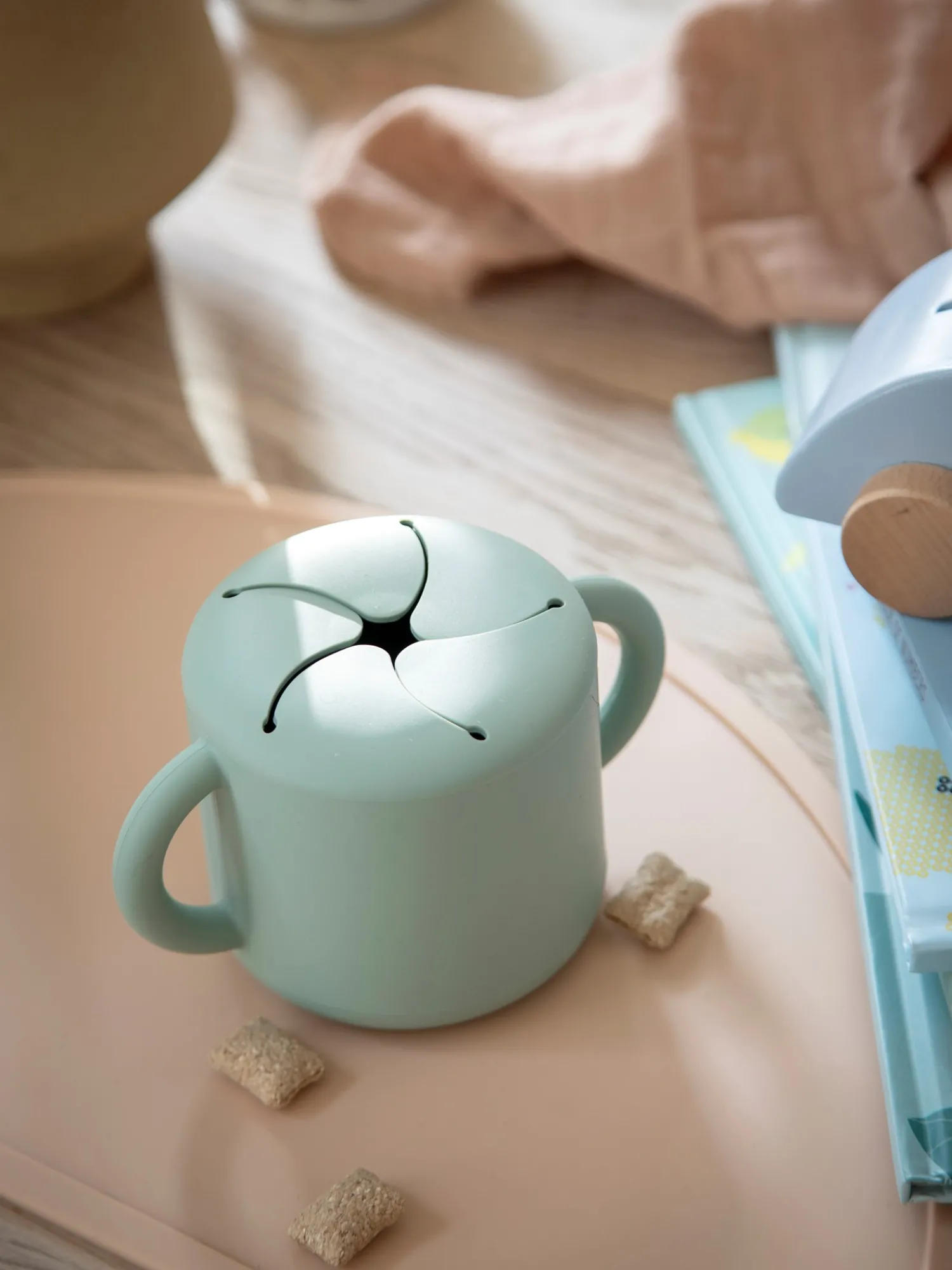 Snackkoppen fra Mushie har håndtag, der gør den ganske praktisk og nem at holde for de kære små. Koppen er lavet af fødevaregodkendt silikone.Den bløde åbning sikrer, at babys hænder let kan glide ind og ud, samtidig med at maden holdes sikkert inde. Denne snackkop er en nødvendighed for småbørn på farten. Søstrene anbefaler, at snackkoppen rengøres med varmt sæbevand og lufttørres.Bemærk venligst, at produktet altid skal bruges under opsyn af en voksen. Undersøg produktet før hver brug. Afskaf ved tegn på skade eller svaghed, og efterlad aldrig et barn uden opsyn, mens barnet bruger dette produkt. Den maksimale temperatur er 392°F (200°C).