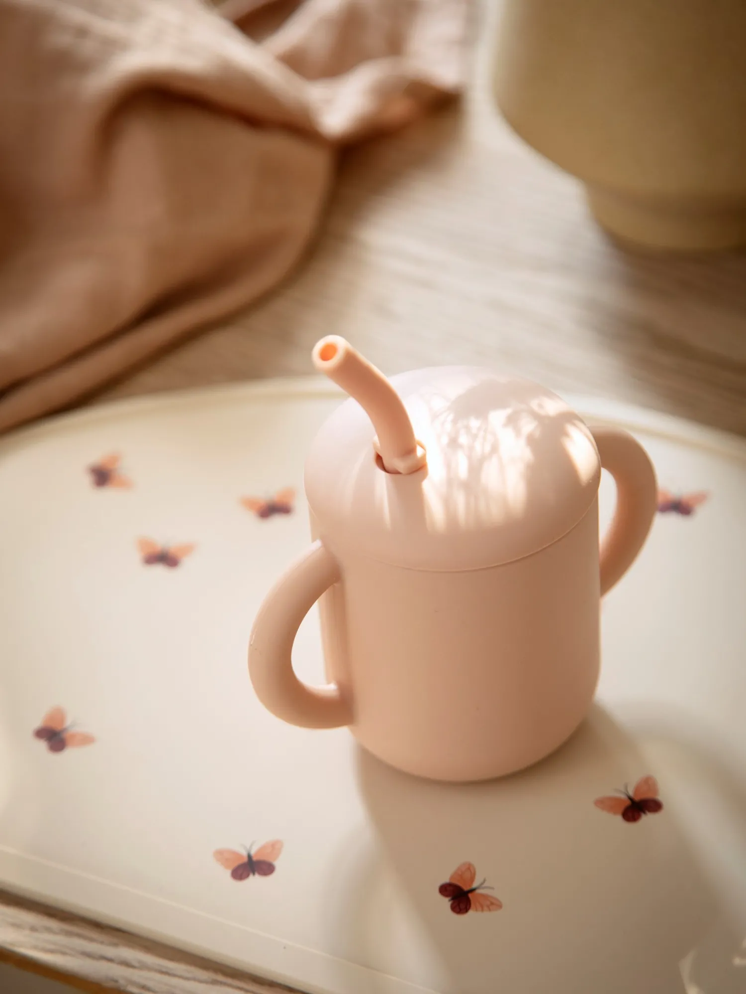 Denne træningskop fra Mushie kommer med et aftageligt låg og et skånsomt sugerør. De to håndtag gør den praktisk og nem at holde for de kære små. Den er lavet af fødevaregodkendt silikone.Koppen kan hjælpe med at opbygge finmotorikken og overgå fra flaske til kop. Den anbefalede alder for dette produkt er 6 måneder og opefter.Søstrene anbefaler at rengøre den med varmt sæbevand og lade den lufttørre.Bemærk venligst, at produktet altid skal bruges under opsyn af en voksen. Undersøg produktet før hver brug. Afskaf ved tegn på skade eller svaghed, og efterlad aldrig et barn uden opsyn, mens barnet bruger dette produkt.
