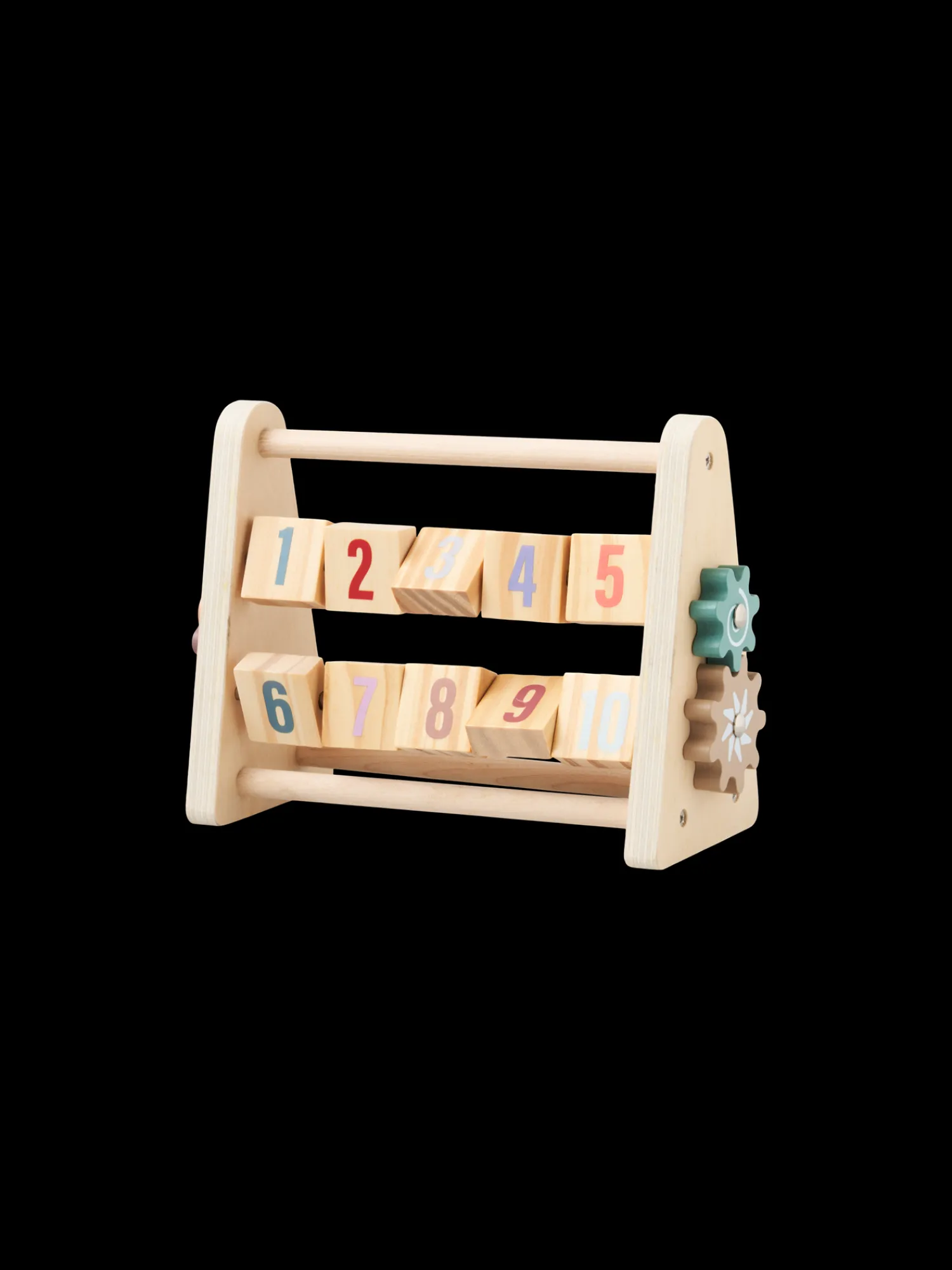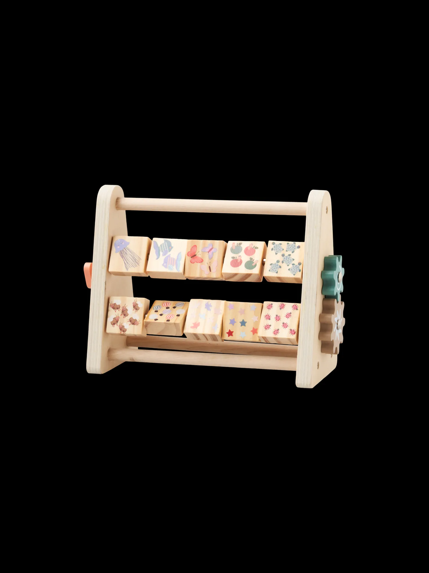 Søstrenes kugleramme med nummerblokke i træ er lavet af 100 % FSC®-certificeret. Den måler 19 x 9,5 x 16.5 cm. Kuglerammen har tallene 1-9 på den ene side af blokkene og på den anden side er søde mønstre, der matcher tallene.