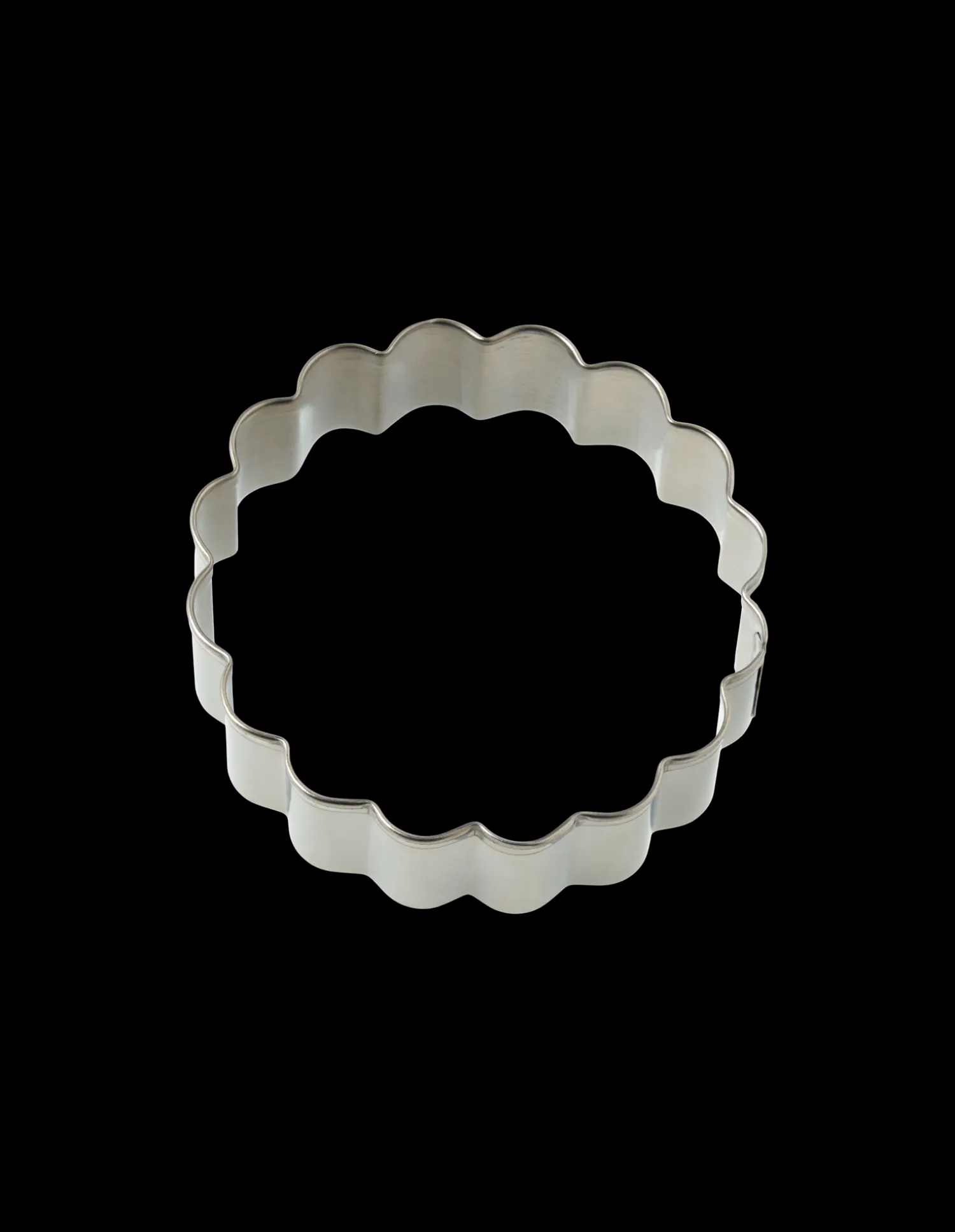 Søstrenes kageudstikker er lavet af rustfrit stål og har en rund, takket form.