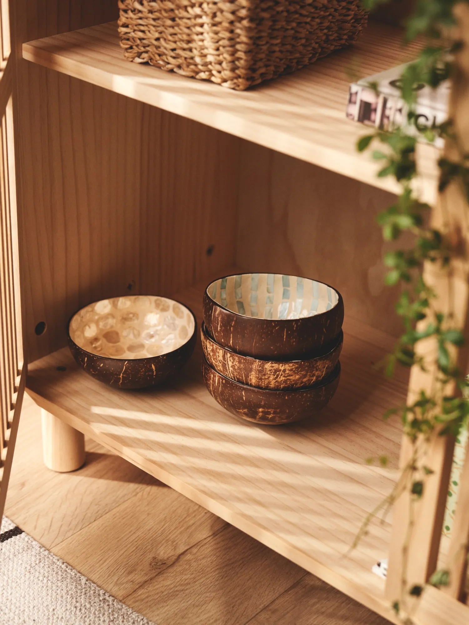 Søstrenes dekorative skål er lavet af naturlig kokosnød med et farverigt laklag på indersiden.Søstrene gør venligst opmærksom på, at da dette produkt er lavet med naturlig kokosnød, kan det variere en smule i størrelse, farve og udtryk. Skålen er heller ikke fødevaresikker og er udelukkende til dekorativ brug.