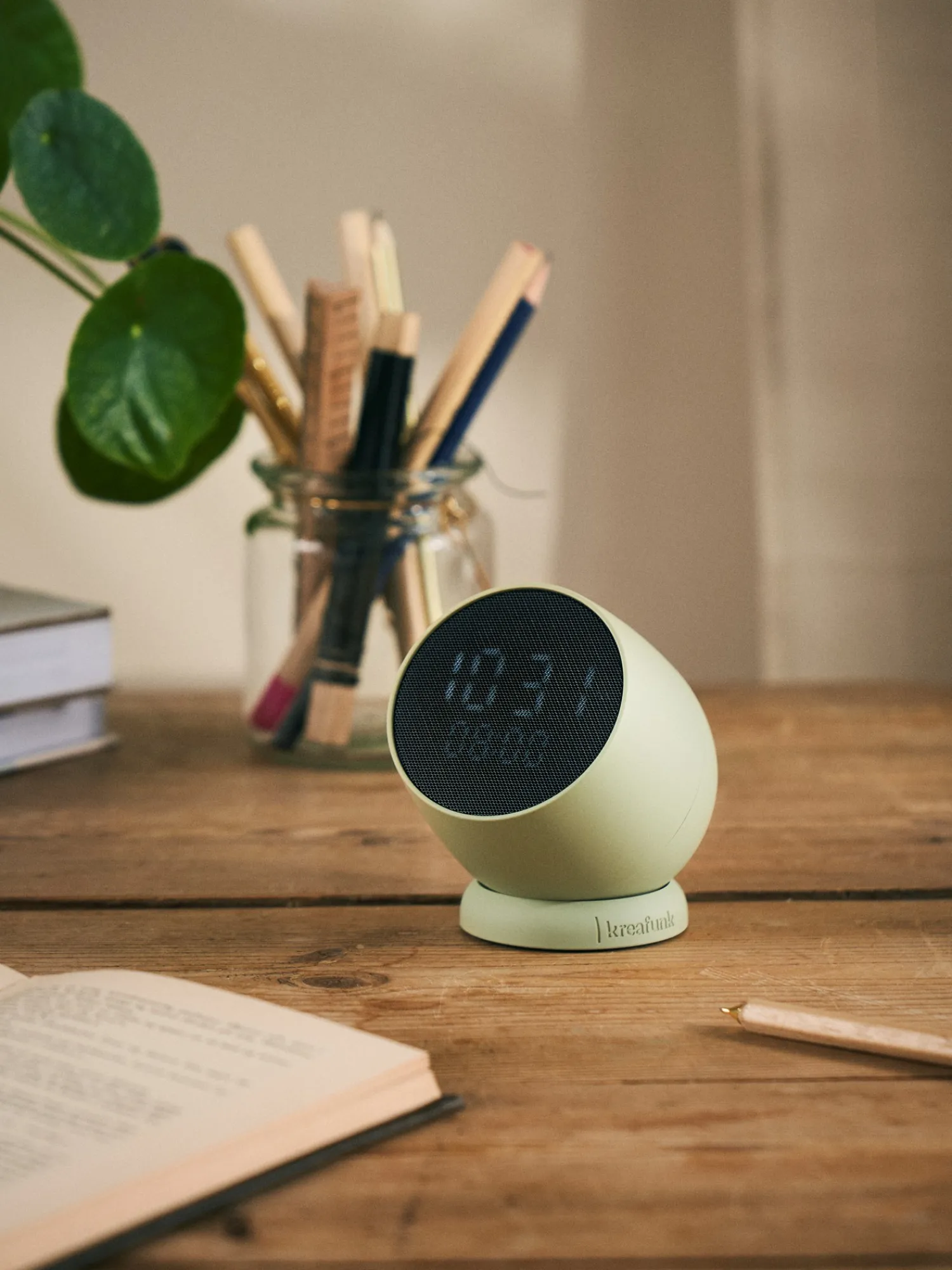 Dette vækkeur fra det danske mærke Kreafunk har et stilfuldt og intuitivt design og er drejeligt i bunden for at give mulighed for nem omplacering. Vækkeuret er lavet af ABS-plast samt metal og silikone.Sluk alarmen om morgenen med et enkelt tryk på en knap, eller vend den blot om for at udsætte den. Vækkeuret fungerer også trådløst med en fuld opladning på 1 til 2 timer og en driftstid på op til 30 dage.