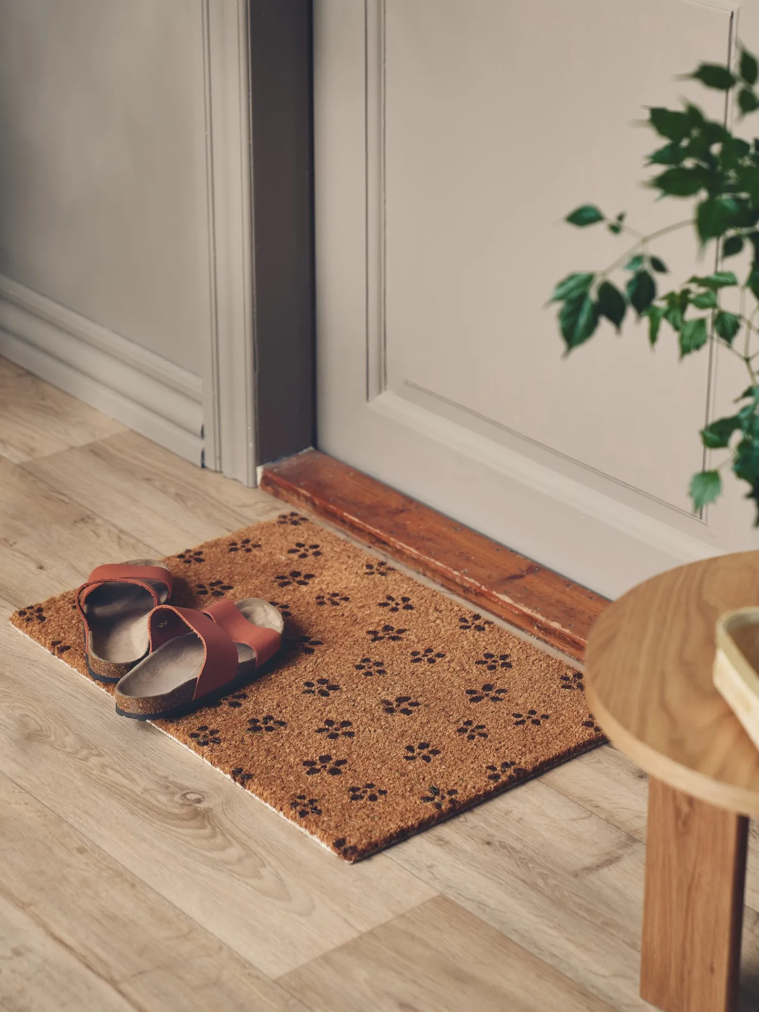 Søstrenes måtte er lavet af kokosfibre med en gummibagside og den måler 40 x 60 cm.Med en skøn måtte i entréen er det nemt at byde gæster velkommen i Deres hjem.