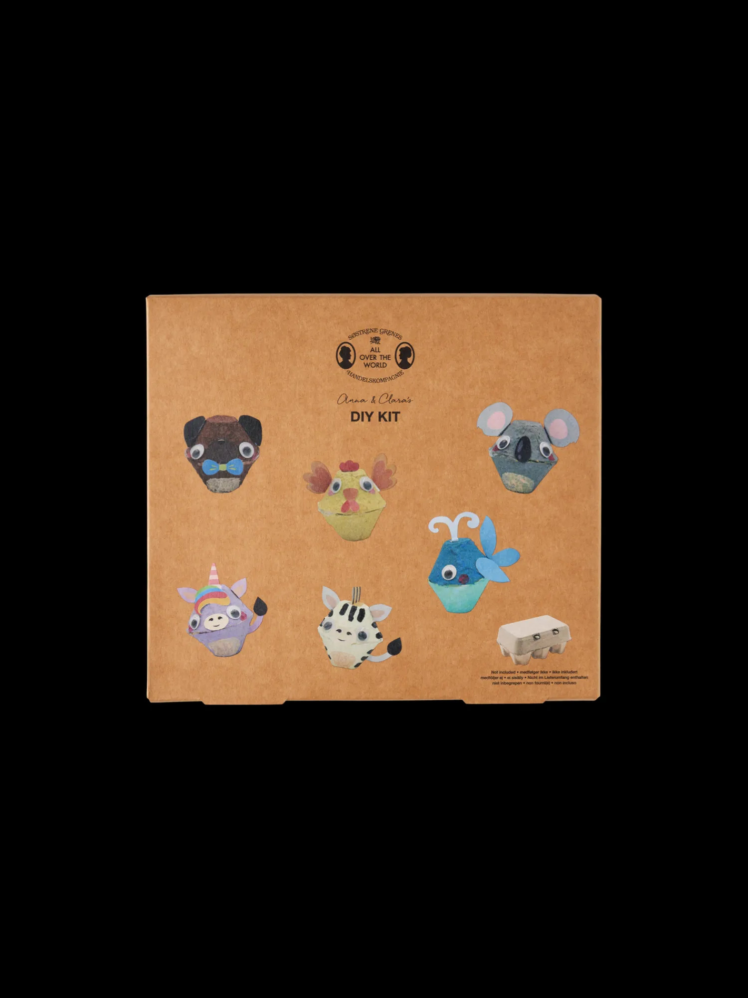 Søstrenes DIY-sæt indeholder materialer til at skabe sjove dyr ud af æggebakker. Sættet leveres med 1 blok hulpapir, 20 selvklæbende øjne, 4 glimmerlime, 12 piberensere, 24 pomponer, 36 glimmerklistermærker, 1 dobbeltklæbende tape, 8 vandbaserede malinger og 1 pensel. Søstrene gør venligst opmærksom på, at æggebakken ikke medfølger.