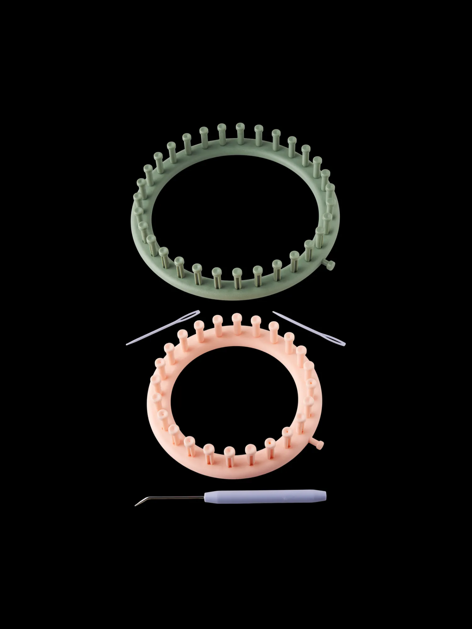 Søstrenes strikkeringe-kit indeholder to strikkeringe, der måler henholdsvis 14 cm og 19 cm, 1 hæklenål og 2 uldnåle.