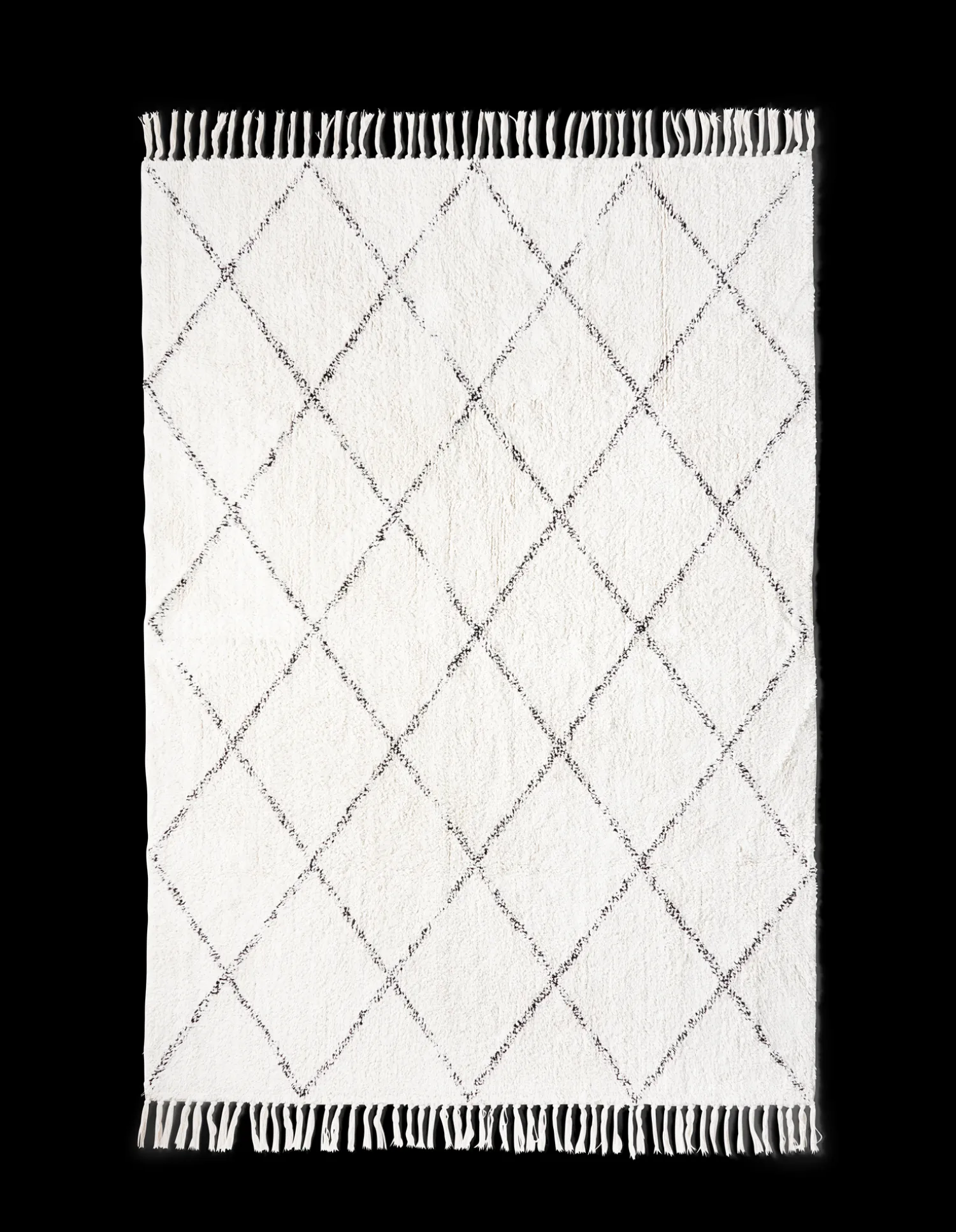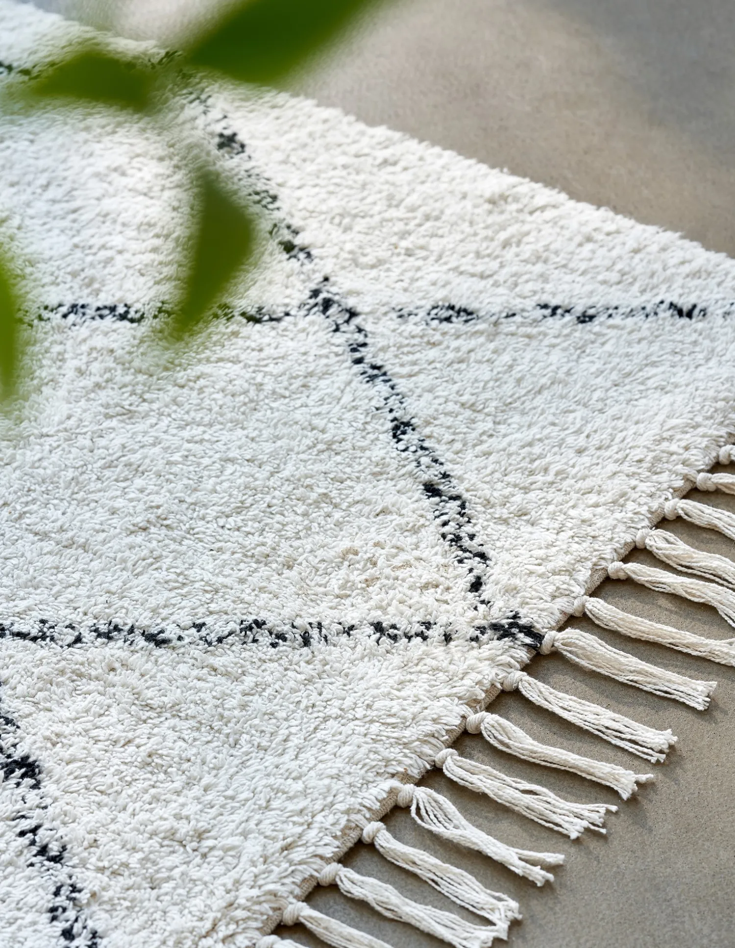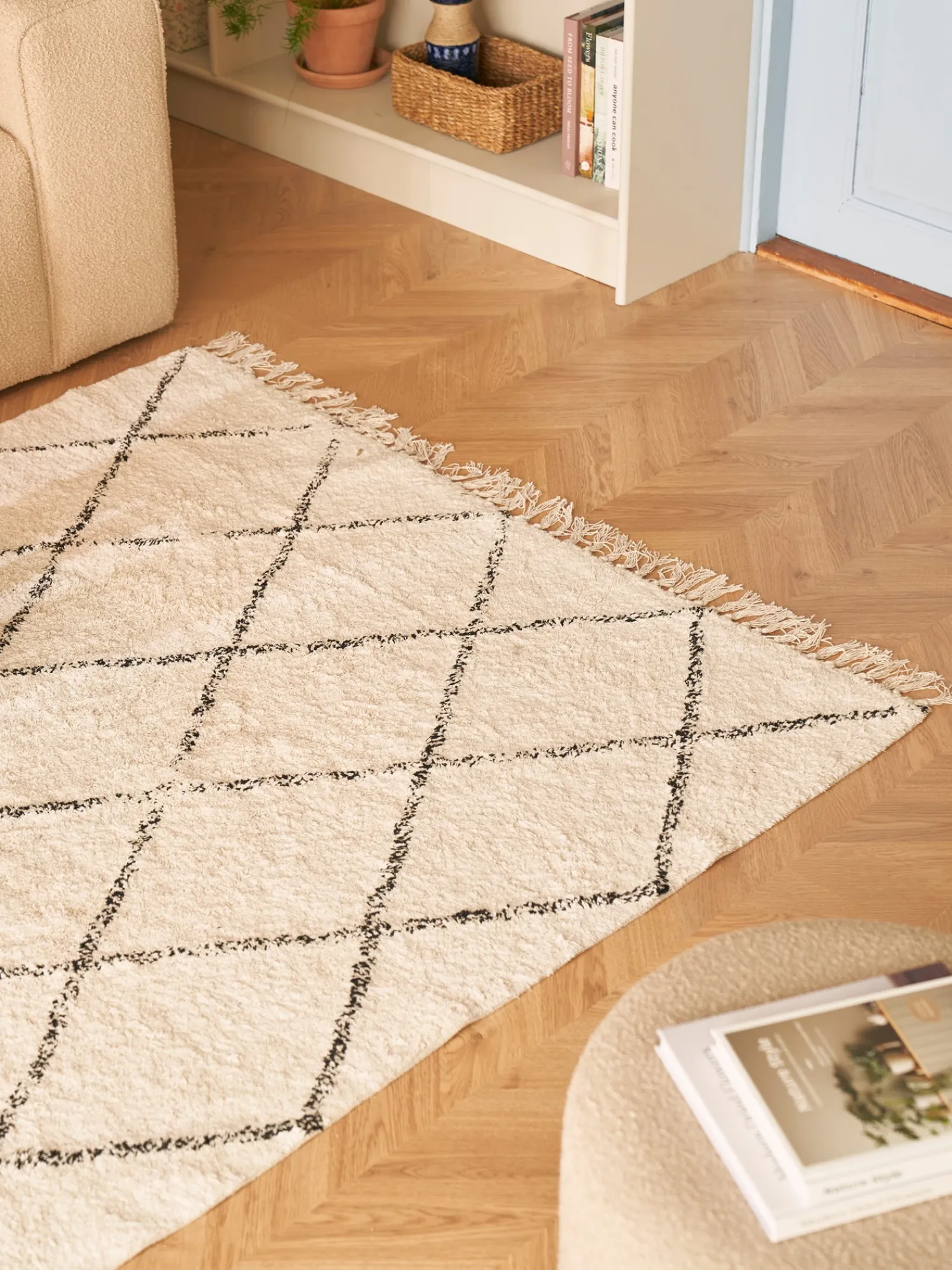 Anna og Clara har indrettet deres entré med varme nuancer og naturlige materialer. Søstrene har lagt bløde gulvtæpper på gulvet og hængt fint flet på væggene. “Det skaber en ro og varme, som er dejligt indbydende for Deres gæster,” siger Clara. Dette gulvtæppe har Clara iklædt romber, da hun synes, at det pynter så fint på gulvet. Søstrenes gulvtæppe er fremstillet i bomuld og måler 190 x 135 cm.