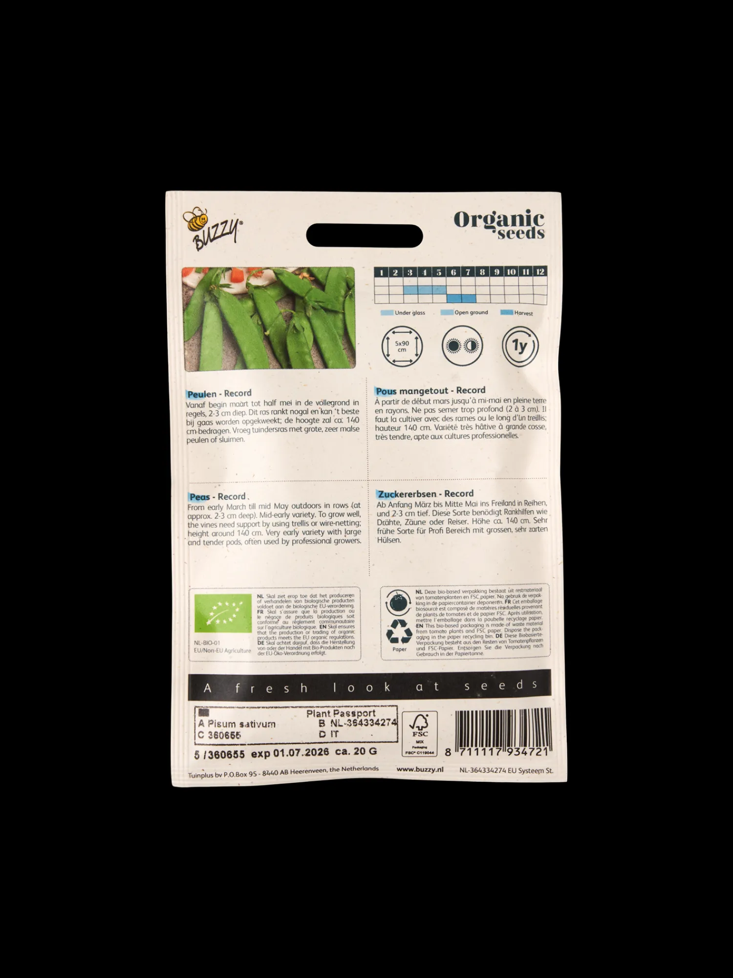Buzzy® økologiske ærtefrø (record) kommer i en pakke på ca. 20 g.Så ærtefrøene i et drivhus fra midten af april og plant dem ud i midten af maj i rækker.