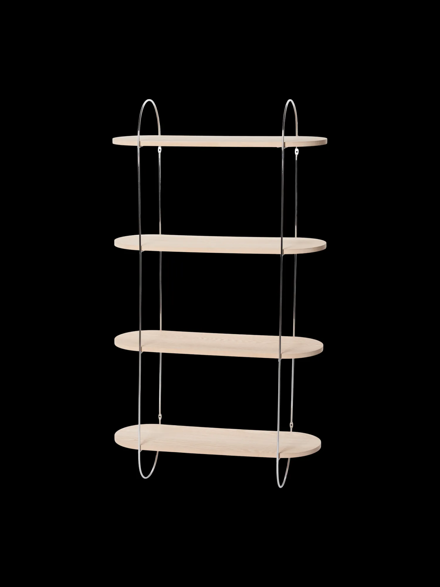 Søstrenes væghylde er fremstillet af 100% FSC®-certificeret MDF med askefinér og jern. Væghylden har 4 hylder.