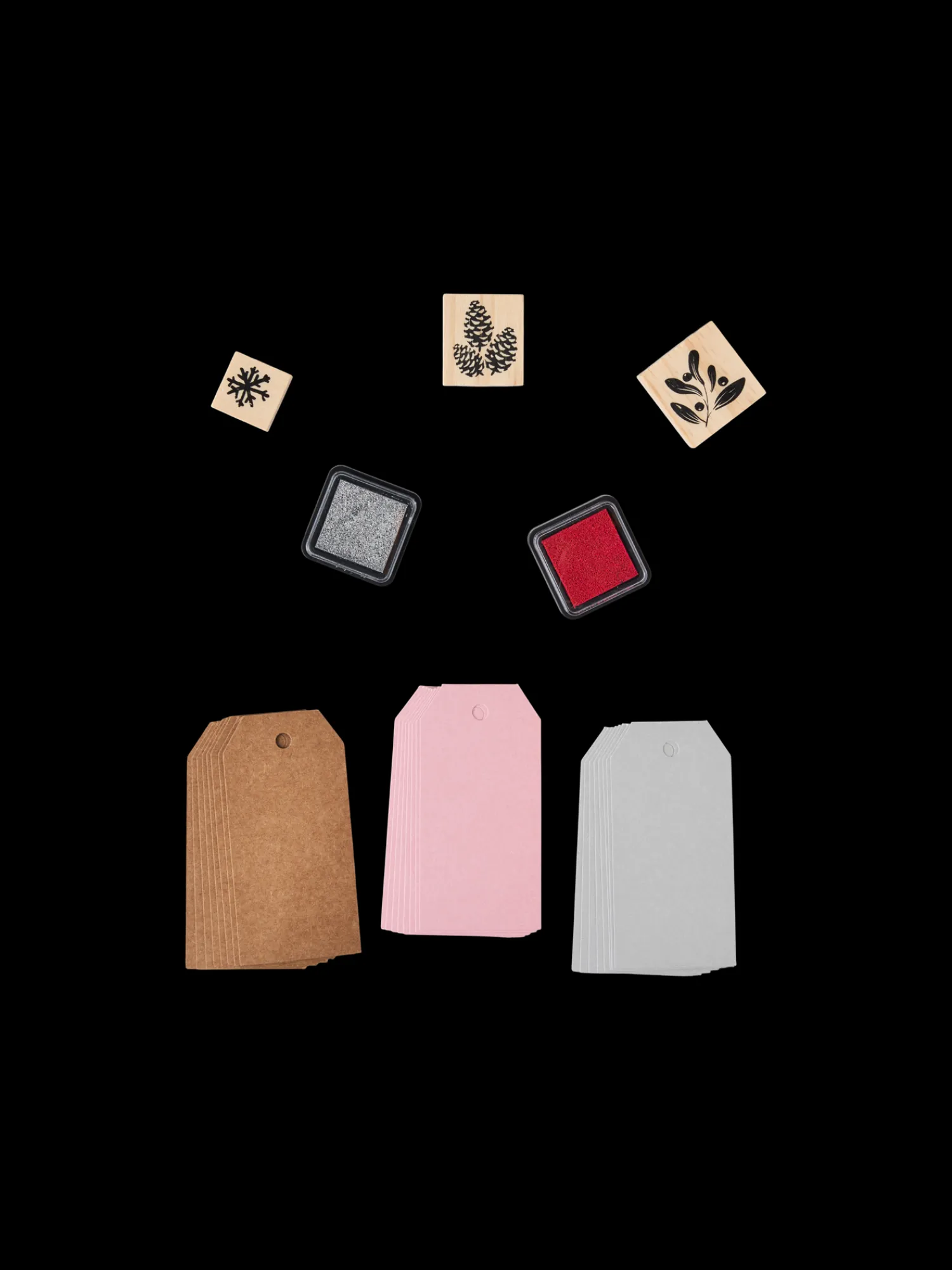 Søstrenes DIY-sæt indeholder 24 manillamærker, der er lavet af 100% FSC®-certificeret papir, samt 3 stempler og 2 stempelpuder.