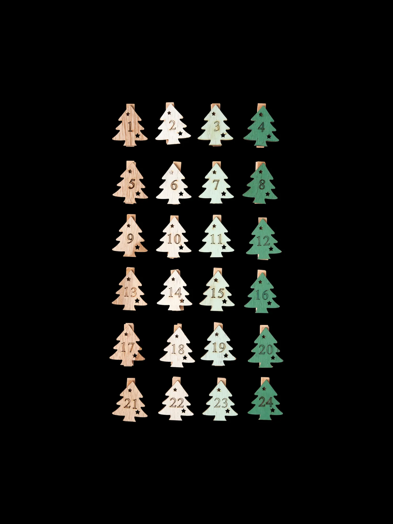 Søstrenes dekorative klemmer er lavet af FSC®-certificeret poppeltræ, og sættet består af 24 styk med en højde på 3,5 cm hver. Tallene fra 1 til 24 optræder på klemmerne, så de er ideelle til at lave Deres egen pakkekalender til de kære små, som de kan nyde i den magiske juletid.