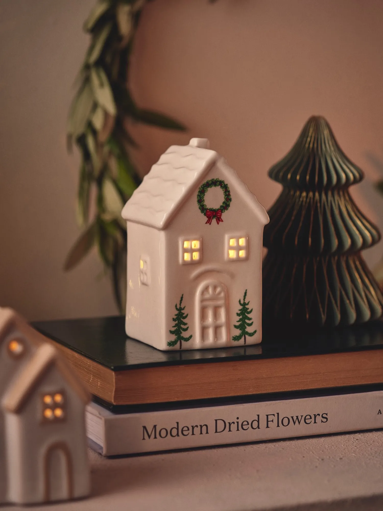 Søstrenes porcelænshus med LED kommer med de nødvendige batterier. De kan indrette de forskellige LED-huse til en charmerende lille juleby og tilføje de herlige, dekorative træer for et endnu mere festligt udtryk.Søstrene gør venligst opmærksom på, at farve og udtryk kan variere en smule, da dette er et glaseret produkt.