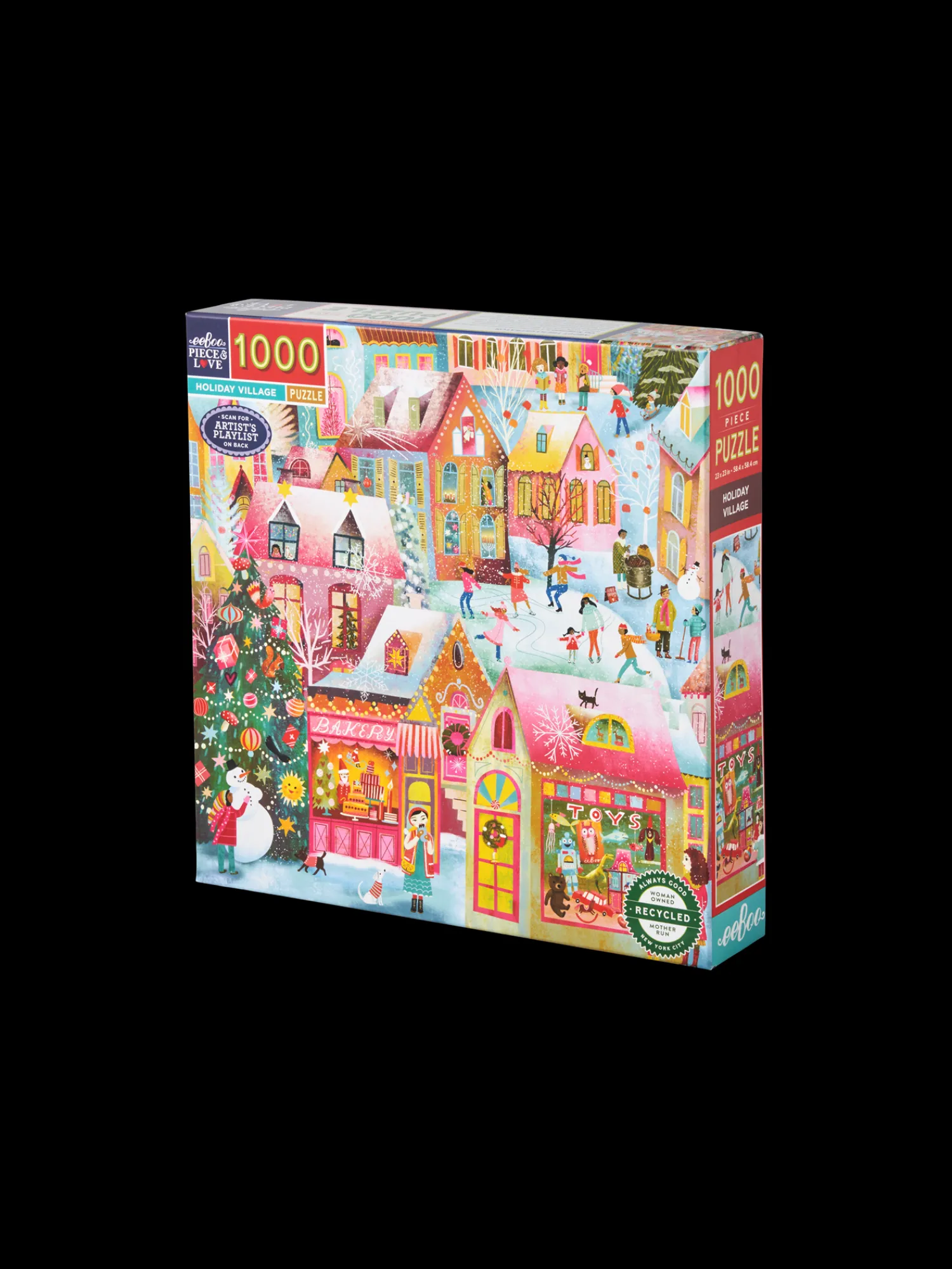 Ferieby-puslespillet fra eeBoo er lavet af papir og måler 58 x 58 cm, når det er samlet. Puslespillet har 1000 brikker. Illustrationen er af Uta Krogmann.