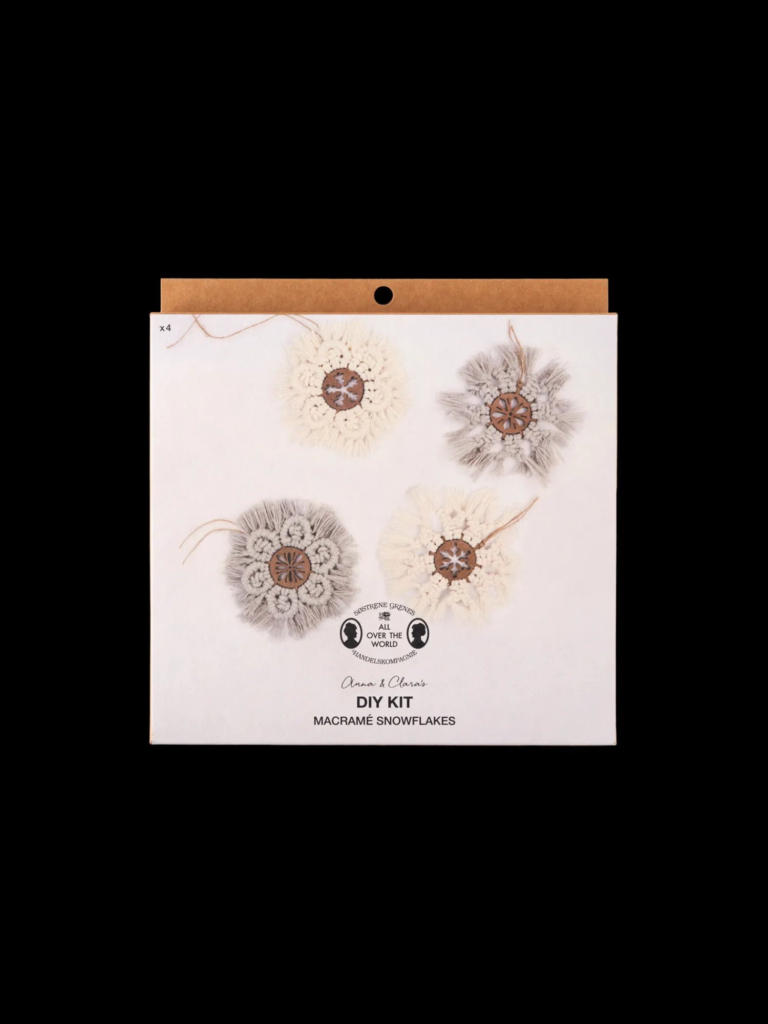 Søstrenes DIY-sæt med makramé indeholder 4 træplader, 2 makramégarner, 1 hampegarn og vejledning til, hvordan man laver 4 snefnug.