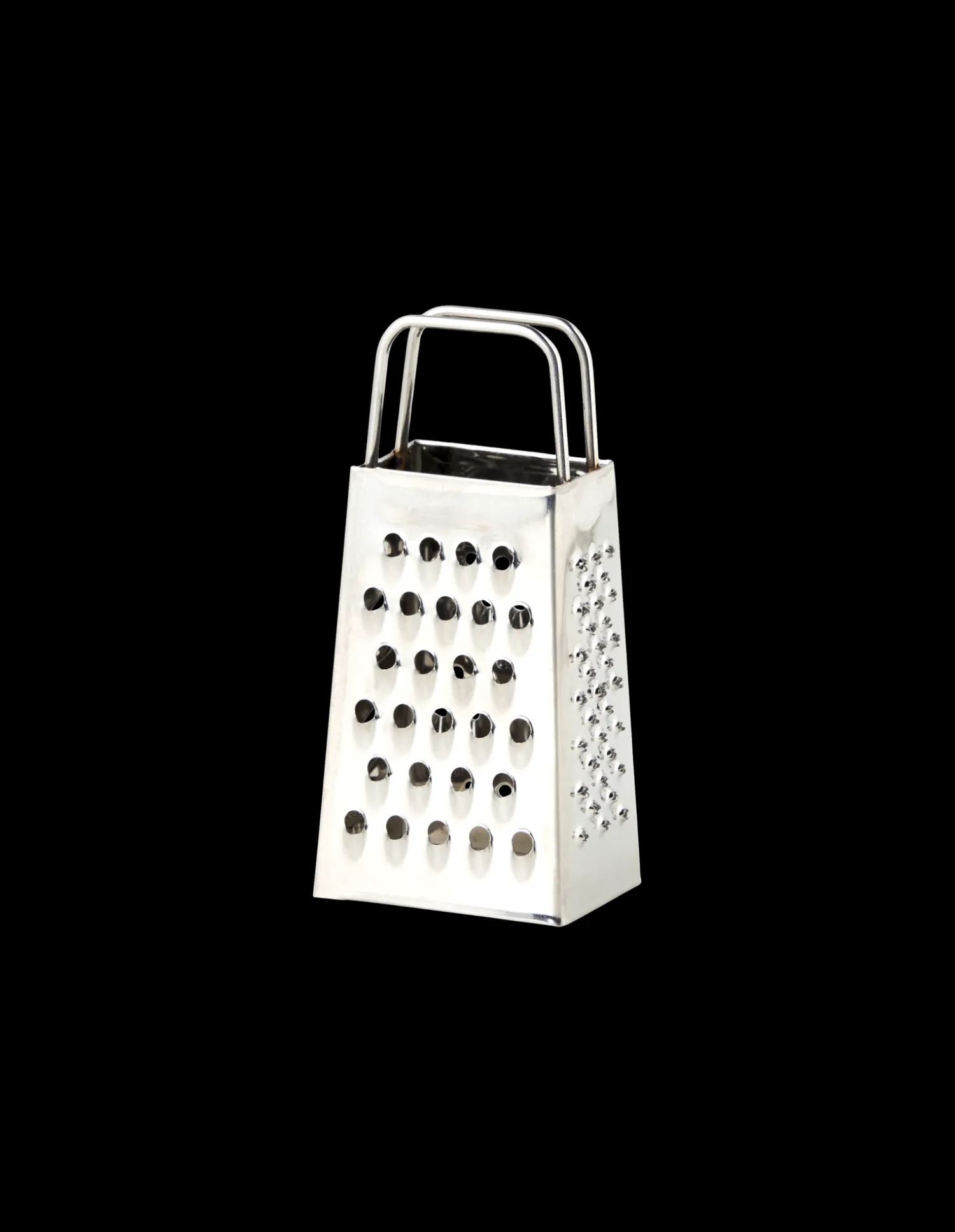 Søstrenes yndige lille rivejern er lavet af rustfrit stål. Det måler 3,5 cm i bredden, 2,8 cm i længden og 8 cm i højden.