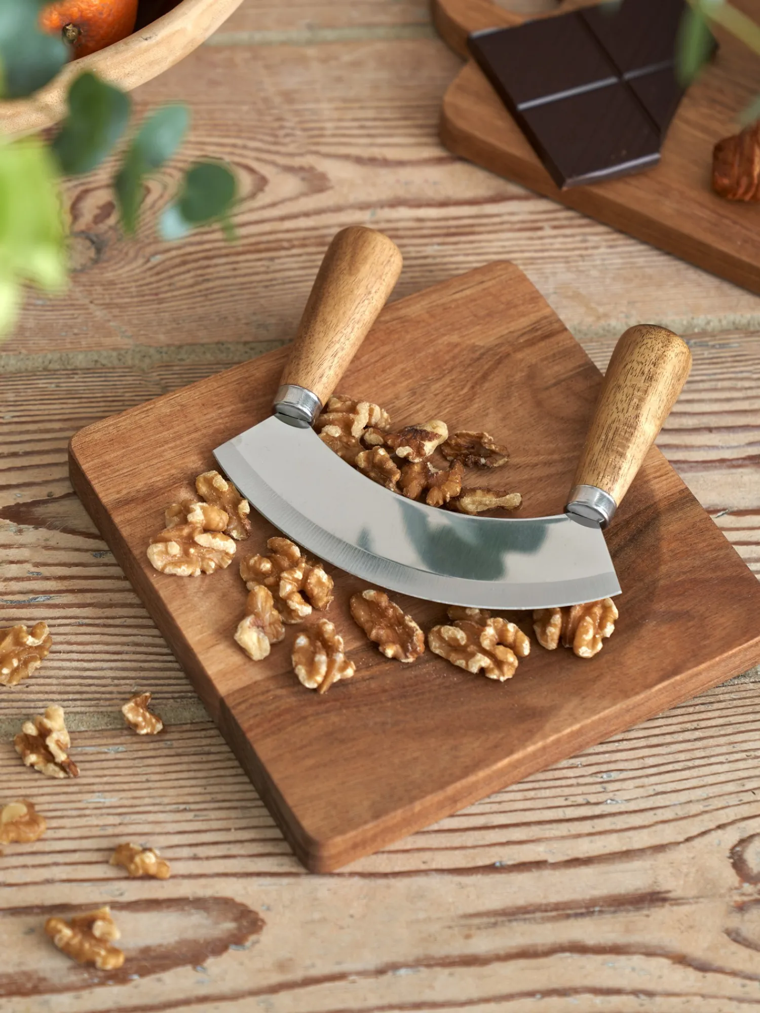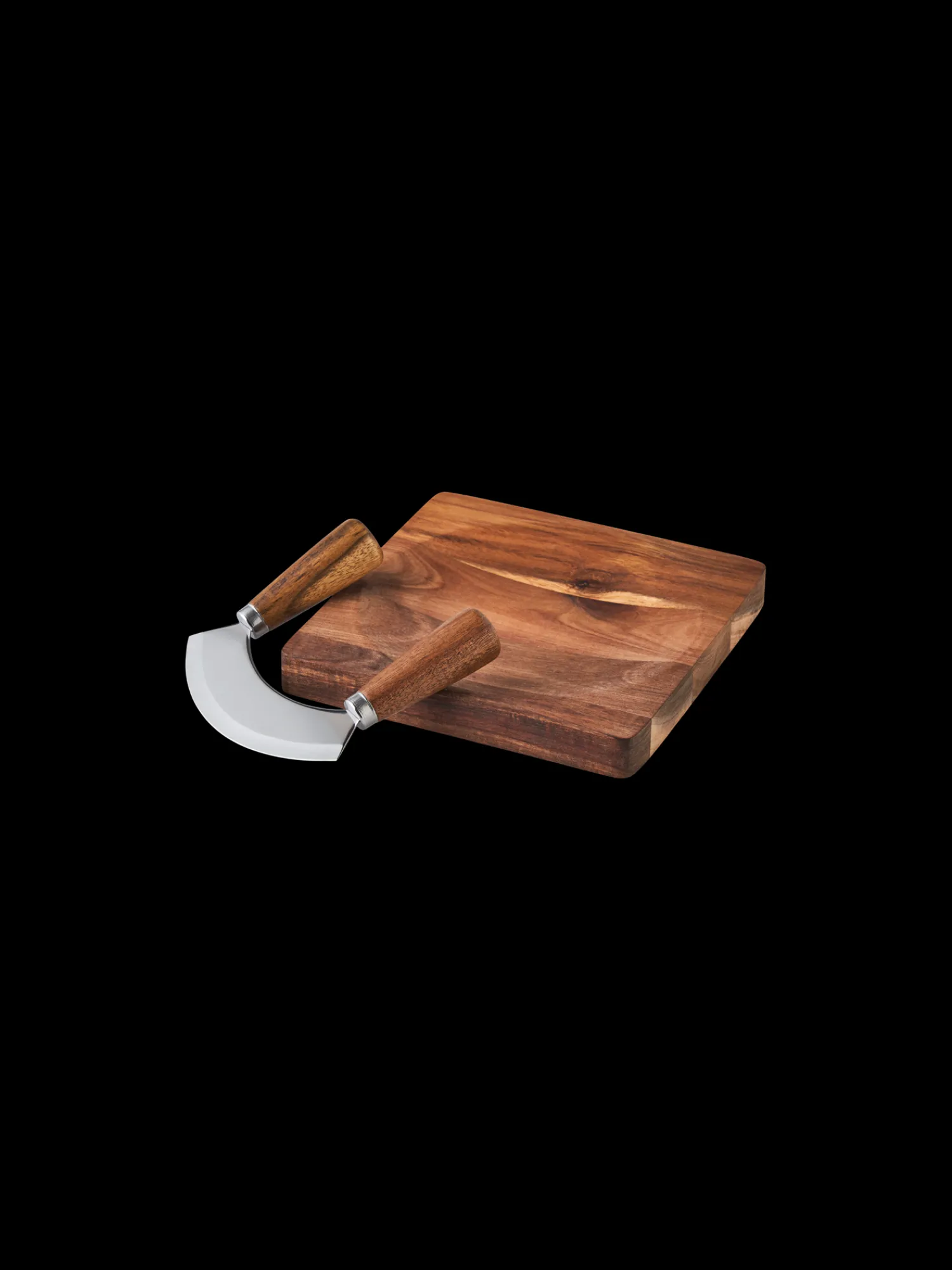Søstrenes urtehakker med skærebræt er lavet af 100% FSC®-certificeret akacietræ og rustfrit stål. Urtehakkeren måler 11 x 13 cm og skærebrættet måler 17 x 17 x 1,9 cm.