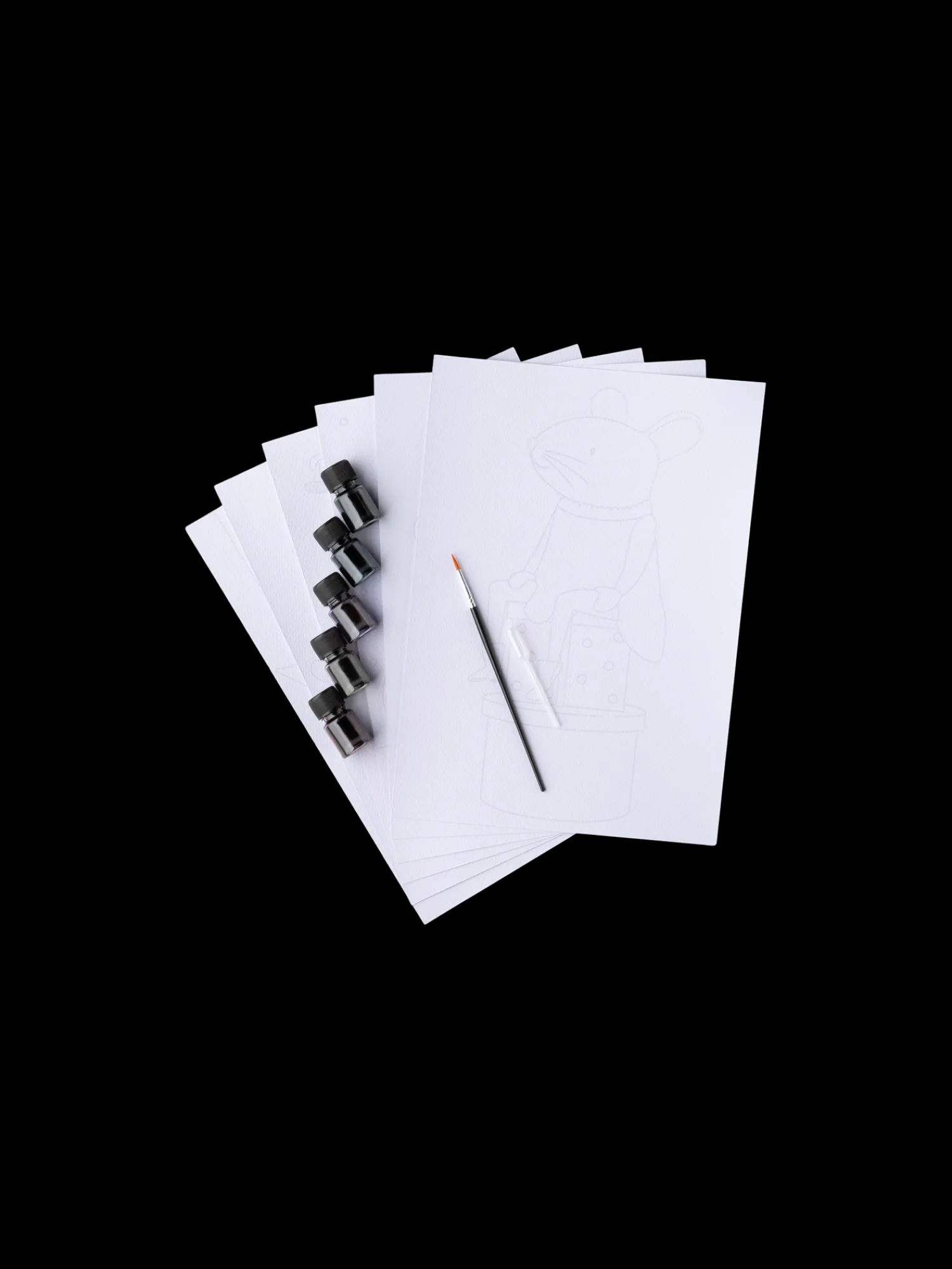 Søstrenes akvarelsæt indeholder 6 ark 100 % FSC®-certificeret papir med motiver, der venter på at blive malet, samt 5 flasker 3 ml flydende akvarelmaling.